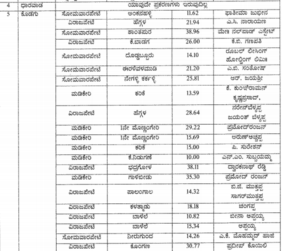 ಕೊಡಗು ಜಿಲ್ಲೆಯಲ್ಲಿ 915.55 ಎಕರೆ, ಬೆಂಗಳೂರು ನಗರ ಜಿಲ್ಲೆಯಲ್ಲಿ 967.14 ಎಕರೆ, ಕೋಲಾರ ಜಿಲ್ಲೆಯಲ್ಲಿ 41.96 ಎಕರೆ, ಶಿವಮೊಗ್ಗ ಜಿಲ್ಲೆಯಲ್ಲಿ 180.05 ಎಕರೆ, ದಕ್ಷಿಣ ಕನ್ನಡದಲ್ಲಿ 107.02 ಎಕರೆ, ಬೆಂಗಳೂರು ಗ್ರಾಮಾಂತರ ಜಿಲ್ಲೆಯಲ್ಲಿ 1,504.08 ಎಕರೆ, ಚಿಕ್ಕಬಳ್ಳಾಪುರ ಜಿಲ್ಲೆಯಲ್ಲಿ 482.09 ಎಕರೆ, ತುಮಕೂರು ಜಿಲ್ಲೆಯಲ್ಲಿ 437.62 ಎಕರೆ, ರಾಮನಗರ ಜಿಲ್ಲೆಯಲ್ಲಿ 615.19 ಎಕರೆ, ಚಿಕ್ಕಮಗಳೂರು ಜಿಲ್ಲೆಯಲ್ಲಿ 126.70 ಎಕರೆ, ಮೈಸೂರಿನಲ್ಲಿ 651.13 ಎಕರೆ ಜಮೀನು ಹಲವು ಪ್ರಭಾವಿಗಳ ಕೈಯಲ್ಲಿರುವುದು ಪಟ್ಟಿಯಿಂದ ತಿಳಿದು ಬಂದಿದೆ.