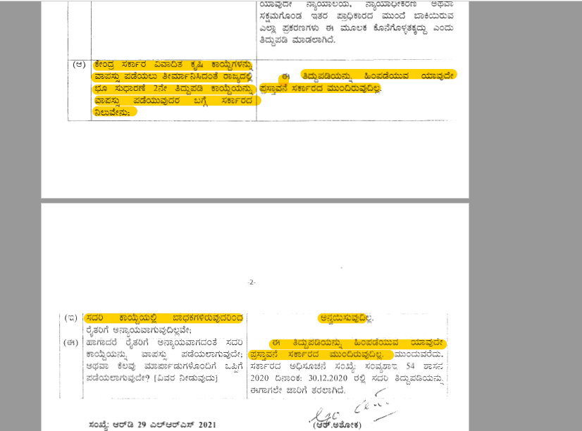 ಅದೇ ರೀತಿ ಕರ್ನಾಟಕ ಕೃಷಿ ಉತ್ಪನ್ನ ಮಾರುಕಟ್ಟೆ ವ್ಯವಹಾರ (ನಿಯಂತ್ರಣ ಮತ್ತು ಅಭಿವೃದ್ಧಿ ) ಅಧಿನಿಯಮ 1966 ರಾಜ್ಯ ಸ್ವತಂತ್ರ ಕಾಯ್ದೆ ಎಂದು ಪ್ರತಿಪಾದಿಸಿರುವ ಸರ್ಕಾರವು ಈ ಅಧಿನಿಯಮದ ಕಲಂ 8(2) ಕಲಂ 8(3) ಮತ್ತು ಕಲಂ 117ಕ್ಕೆ 2020ರ ಡಿಸೆಂಬರ್ 31ಕ್ಕೆ ತರಲಾಗಿರುವ ತಿದ್ದುಪಡಿಯನ್ನು ರಾಜ್ಯದ ಹಿತಾಸಕ್ತಿಗಳಿಗೆ ಅನುಗುಣವಾಗಿ ಪರಿಶೀಲಿಸಿ ತಿದ್ದುಪಡಿಯ ಅನುಕೂಲ ಮತ್ತು ಅನಾನುಕೂಲಗಳನ್ನು ಪರಿಶೀಲಿಸಿ ಸೂಕ್ತ ನಿರ್ಧಾರ ಕೈಗೊಳ್ಳಲು ನಿಲುವು ತಳೆದಿದೆ.