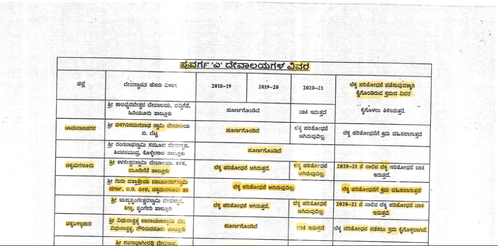 ಕರ್ನಾಟಕ ಹಿಂದೂ ಧಾರ್ಮಿಕ ಸಂಸ್ಥೆಗಳು ಮತ್ತು ಧರ್ಮಾದಾಯ ದತ್ತಿಗಳ ಅಧಿನಿಯಮದ ಪ್ರಕಾರ ಪ್ರವರ್ಗ ಎ ಮತ್ತು ಪ್ರವರ್ಗ ಬಿ ಪಟ್ಟಿಯಲ್ಲಿರುವ ದೇವಸ್ಥಾನಗಳು ಪ್ರತಿ ವರ್ಷವೂ ರಾಜ್ಯ ಲೆಕ್ಕಪತ್ರ ಇಲಾಖೆಯಿಂದ ಲೆಕ್ಕ ಪರಿಶೋಧನೆ ನಡೆಸಬೇಕು. ಆದರೆ ರಾಜ್ಯದ ಹಲವು ಜಿಲ್ಲೆಗಳಲ್ಲಿರುವ ನೂರಾರು ದೇವಸ್ಥಾನಗಳು ಕಳೆದ ಮೂರು ವರ್ಷಗಳಲ್ಲಿ ಲೆಕ್ಕ ಪರಿಶೋಧನೆಯನ್ನೇ ನಡೆಸಿಲ್ಲ. ಹೀಗಾಗಿ ಈ ದೇವಸ್ಥಾನಗಳಲ್ಲಿ ನಡೆದಿದೆ ಎನ್ನಲಾಗಿರುವ ಅಕ್ರಮ, ಅವ್ಯವಹಾರ, ಹಣಕಾಸು ದುರುಪಯೋಗದಂತಹ ಪ್ರಕರಣಗಳು ಬಯಲಿಗೇ ಬಂದಿಲ್ಲ!