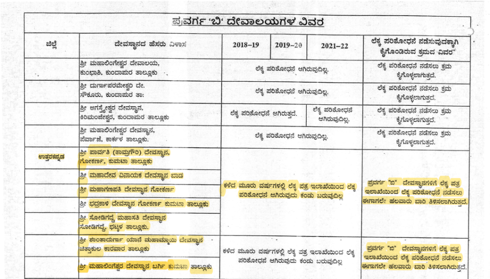 ಬ್ರಹ್ಮಾವರದ ನೀಲಾವರದ ಮಹಿಷ ಮರ್ದಿನಿ, ಕೋಟದ ಅಮೃತೇಶ್ವರಿ, ಹಿರಿಯಡ್ಕದ ವೀರಭದ್ರ, ಕಾಪು ಜನಾರ್ಧನ, ಎಲ್ಲೂರಿನ ವಿಶ್ವೇಶ್ವರ, ಕಡಿಯಾಳಿಯ ಮಹಿಷ ಮರ್ದಿನಿ, ಗುಡ್ಡೆಟ್ಟು ಶ್ರೀ ವಿನಾಯಕ, ಸೇನಾಪುರದ ಸುಬ್ರಹ್ಮಣ್ಯ, ಮುಂಡ್ಕೂರಿನ ದುರ್ಗಾಪರಮೇಶ್ವರಿ, ಕೋಟೇಶ್ವರದ ಕೋಟಿಲಿಂಗೇಶ್ವರ, ಶಿರಸಿಯ ಮಾರಿಕಾಂಬ, ಇಡಗುಂಜಿಯ ವಿನಾಯಕ, ಭಟ್ಕಳದ ಸೂಸಗಡಿ ಚನ್ನಪಟ್ಟಣ ಹನುಮಂತ, ಶಿರಾಲಿಯ ದುರ್ಗಾಪರಮೇಶ್ವರಿ, ಶಿರಸಿ ತಾಲೂಕಿನ ಮಹಾಗಣಪತಿ ಶಂಕರ, ಮಂಜುಗುಣಿಯ ವೆಂಕರಮಣ, ಬಾಡ, ಗುಡೋ ಅಂಗಡಿಯ ಕಾಂಚಿಕಾ ಪರಮೇಶ್ವರಿ, ಬನವಾಸಿಯ ಮಧುಕೇಶ್ವರ, ಭಟ್ಕಳದ ಮುರ್ಡೇಶ್ವರ, ದೇವಸ್ಥಾನದಲ್ಲಿ 2018-19, 2019-20, 2020-21ನೇ ಸಾಲಿನ ಮೂರೂ ವರ್ಷಗಳಲ್ಲೂ ಲೆಕ್ಕ ಪರಿಶೋಧನೆ ಆಗಿಲ್ಲ.