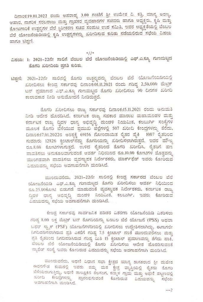 ಆಹಾರ, ನಾಗರಿಕ ಸರಬರಾಜು ಮತ್ತು ಗ್ರಾಹಕರ ವ್ಯವಹಾರಗಳ ಸಚಿವ ಉಮೇಶ್ ಕತ್ತಿ ಅಧ್ಯಕ್ಷತೆಯಲ್ಲಿ ರಚಿಸಿರುವ ಕೃಷಿ ಮತ್ತು ತೋಟಗಾರಿಕಾ ಉತ್ಪನ್ನಗಳ ಬೆಲೆ ಕುಸಿದಾಗ ಬೆಲೆಗಳ ಸ್ಥಿರೀಕರಣಕ್ಕಾಗಿ ಬೆಂಬಲ ಬೆಲೆ ನಿಗದಿಪಡಿಸುವ ಕುರಿತು ರಚನೆಯಾಗಿರುವ ಸಚಿವ ಸಂಪುಟ ಉಪ ಸಮಿತಿಯು 2022ರ ಜನವರಿ 19ರಂದು ನಡೆಸಿದ ಸಭೆಯಲ್ಲಿ ಸಹಕಾರ ಇಲಾಖೆಯು ಈ ವಿಷಯವನ್ನು ಮಂಡಿಸಿದೆ. ಸಭೆಗೆ ಮಂಡಿಸಿರುವ ಟಿಪ್ಪಣಿ ವಿವರಗಳು ‘ದಿ ಫೈಲ್’ಗೆ ಲಭ್ಯವಾಗಿದೆ.
