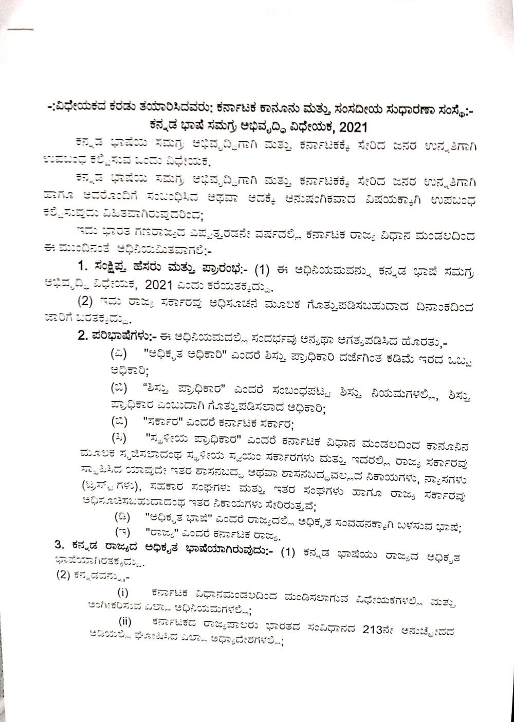 ಬೆಂಗಳೂರು; ಕನ್ನಡ ಭಾಷೆಯ ಸಮಗ್ರ ಅಭಿವೃದ್ಧಿ ಮತ್ತು ಕರ್ನಾಟಕಕ್ಕೆ ಸೇರಿದ ಜನರ ಉನ್ನತಿಗಾಗಿ ಕನ್ನಡ ಅಭಿವೃದ್ಧಿ ಪ್ರಾಧಿಕಾರವು ಇದೇ ಮೊದಲ ಬಾರಿಗೆ ಕನ್ನಡ ಭಾಷೆ ಸಮಗ್ರ ಅಭಿವೃದ್ಧಿ ವಿಧೇಯಕವನ್ನು ಸರ್ಕಾರಕ್ಕೆ ಸಲ್ಲಿಸಿದೆ. ಇದೇ ವಿಧೇಯಕದಲ್ಲಿ ರಾಜಭಾಷಾ ಆಯೋಗದ ರಚನೆ, ಖಾಸಗಿ ಕೈಗಾರಿಕೆ, ಕಾರ್ಯಸಂಸ್ಥೆಗಳಲ್ಲಿ ಕರ್ನಾಟಕಕ್ಕೆ ಸೇರಿದ ವ್ಯಕ್ತಿಗಳಿಗೆ ಮೀಸಲಾತಿ ಕಲ್ಪಿಸಲು ಈ ವಿಧೇಯಕದ ಮೂಲಕ ಸಮಗ್ರ ಕಾನೂನು ತರಲು ಪ್ರಸ್ತಾಪಿಸಲಾಗಿದೆ.