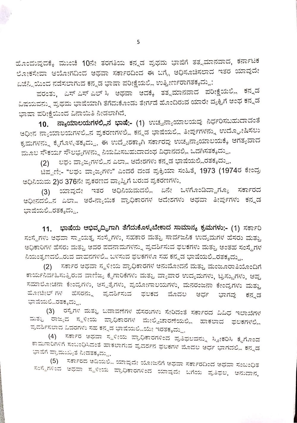 ಆಧೀನ ನ್ಯಾಯಾಲಯಗಳಲ್ಲಿನ ಪ್ರಕರಣಗಳಿಗೆ ಸಂಬಂಧಿಸಿದಂತೆ ಕನ್ನಡ ಭಾಷೆಯಲ್ಲಿ ತೀರ್ಪುಗಳನ್ನು ಉದ್ಘೋಷಿಸಲು ಕ್ರಮ ಕೈಗೊಳ್ಳುವ ಸಂಬಂಧ ಸರ್ಕಾರವು ಉಚ್ಛ ನ್ಯಾಯಾಲಯಕ್ಕೆ ಅಗತ್ಯವಾದ ಮೂಲಸೌಕರ್ಯ ಸೌಲಭ್ಯಗಳನ್ನು ಒದಗಿಸಿಕೊಡಲು ವಿಧೇಯಕದಲ್ಲಿ ಅವಕಾಶ ಕಲ್ಪಿಸಲಾಗಿದೆ. ಅದೇ ರೀತಿ ಲಘು ವ್ಯಾಜ್ಯಗಳಲ್ಲಿ ಎಲ್ಲಾ ಆದೇಶಗಳೂ ಕನ್ನಡ ಭಾಷೆಯಲ್ಲಿಯೇ ಇರಬೇಕು. (ದಂಡ ಪ್ರಕ್ರಿಯಾ ಸಂಹಿತೆ 1973 (1974ರ ಕೇಂದ್ರ ಅಧಿನಿಯಮ 2)ರ 376ನೇ ಪ್ರಕರಣದ ವ್ಯಾಪ್ತಿಗೆ ಬರುವ ಪ್ರಕರಣಗಳು) ಅದೇ ರೀತಿ ಯಾವುದೇ ಇತರೆ ಅಧಿನಿಯಮದಲ್ಲಿ ಏನೇ ಒಳಗೊಂಡಿದ್ದರೂ ಸರ್ಕಾರದ ಅಧೀನದಲ್ಲಿನ ಎಲ್ಲಾ ಅರೆ ನ್ಯಾಯಿಕ ಪ್ರಾಧಿಕಾರಗಳ ಆದೇಶಗಳು ಅಥವಾ ತೀರ್ಪುಗಳು ಕನ್ನಡ ಭಾಷೆಯಲ್ಲಿರಬೇಕು ಎಂದಿದೆ.