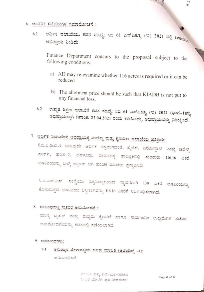 ಅದೇ ರೀತಿ ಕೈಗಾರಿಕೆ ಮತ್ತು ವಾಣಿಜ್ಯ ಇಲಾಖೆಯು ಪ್ರಸ್ತಾಪಿಸಿದ್ದ 116.16 ಎಕರೆ ಸಂಸ್ಥೆಗೆ ಅವಶ್ಯಕತೆ ಇದೆಯೇ ಅಥವಾ ಕಡಿಮೆಗೊಳಿಸಬಹುದೇ ಎಂಬ ಬಗ್ಗೆ ಮರು ಪರಿಶೀಲಿಸಬೇಕು. ಹಂಚಿಕೆಗೆ ನಿಗದಿಪಡಿಸಿದ್ದ ದರವು ಕರ್ನಾಟಕ ಕೈಗಾರಿಕಾ ಪ್ರದೇಶಾಭಿವೃದ್ಧಿ ಮಂಡಳಿಗೆ ನಷ್ಟವುಂಟಾಗುವುದಿಲ್ಲವೇ ಎಂದು ಆರ್ಥಿಕ ಇಲಾಖೆಯು ಪ್ರಶ್ನಿಸಿತ್ತು. ‘ಕೆಐಎಡಿಬಿಗೆ ಯಾವುದೇ ಆರ್ಥಿಕ ನಷ್ಟವಾಗದಂತೆ ಹೈಟೆಕ್, ಏರೋಸ್ಪೇಸ್ ಮತ್ತು ಡಿಫೆನ್ಸ್ ಪಾರ್ಕ್ ಹಂತ-2 ಹರಳೂರು ದೇವನಹಳ್ಳಿ ತಾಲೂಕಿನಲ್ಲಿ ಸುಮಾರು 116.16 ಎಕರೆ ಭೂಮಿಯನ್ನು ಬಲ್ಕ್ ಲ್ಯಾಂಡ್ ಆಗಿ ಹಂಚಿಕೆ ಮಾಡಬಹುದು,’ ಎಂದು ಪ್ರಸ್ತಾಪಿಸಿತ್ತು.