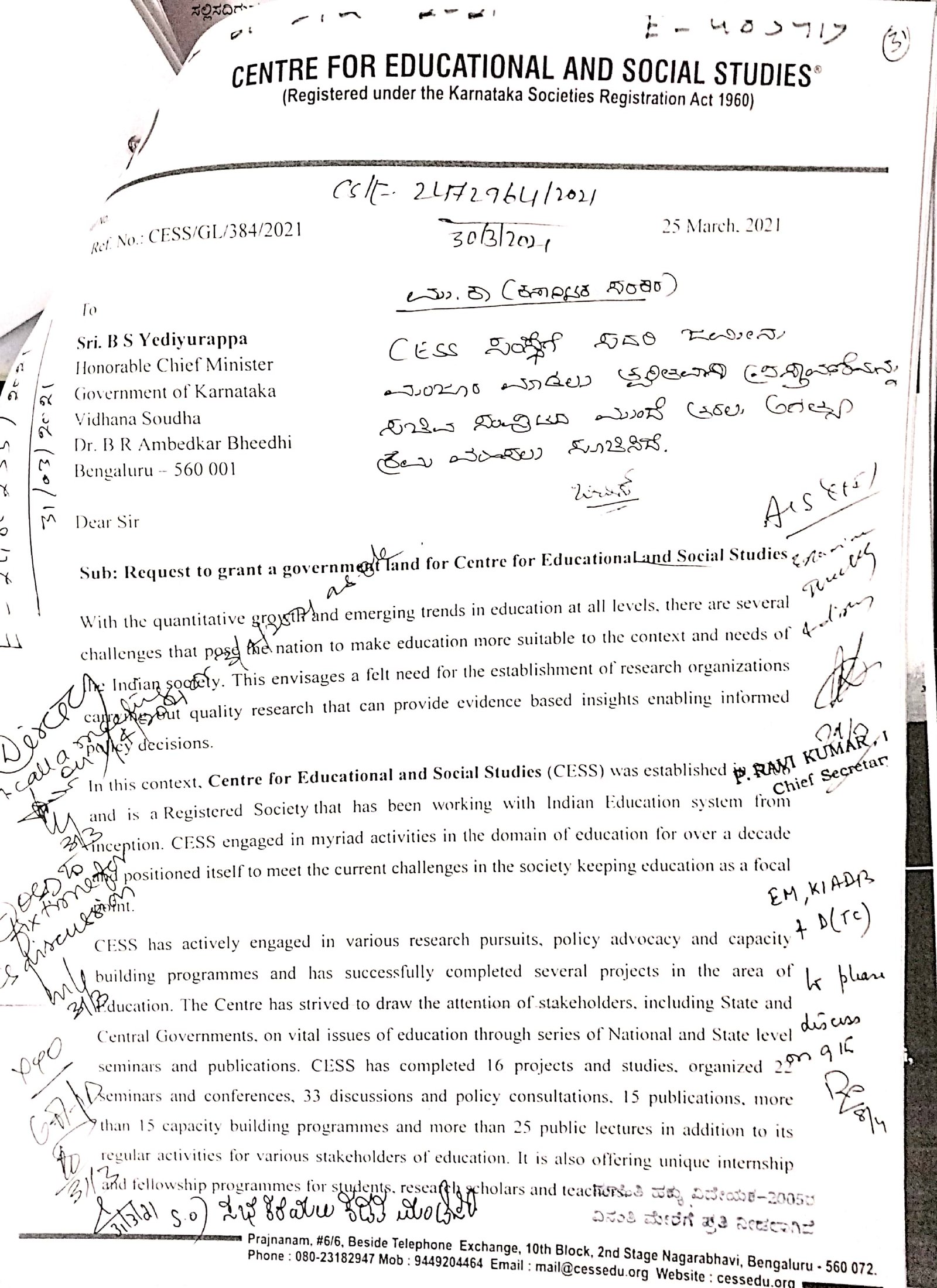ಸೆಸ್ ಸಂಸ್ಥೆಯು ಜಮೀನು ಮಂಜೂರು ಮಾಡಿಸಿಕೊಳ್ಳುವ ಸಲುವಾಗಿ 2021ರ ಮಾರ್ಚ್ 25ರಂದು ಅಂದಿನ ಮುಖ್ಯಮಂತ್ರಿ ಯಡಿಯೂರಪ್ಪ ಅವರಿಗೆ ಪತ್ರ ಬರೆದಿದ್ದರು. ಇದಕ್ಕೆ ತಕ್ಷಣವೇ ಸ್ಪಂದಿಸಿದ್ದ ಯಡಿಯೂರಪ್ಪ ಅವರು ‘ಸೆಸ್ ಸಂಸ್ಥೆಗೆ ಜಮೀನು ಮಂಜೂರು ಮಾಡಲು ತ್ವರಿತವಾಗಿ ಪ್ರಸ್ತಾವನೆಯನ್ನು ಸಚಿವ ಸಂಪುಟದ ಮುಂದೆ ತರಲು ಅಗತ್ಯ ಕ್ರಮ ವಹಿಸಲು ಸೂಚಿಸಿದೆ,’ ಎಂದು ಸೆಸ್ ಸಂಸ್ಥೆಯ ಕಾರ್ಯದರ್ಶಿ ನಾಗರಾಜ ರೆಡ್ಡಿ ಅವರು ಬರೆದಿದ್ದ ಪತ್ರದ ಮೇಲೆಯೇ ಟಿಪ್ಪಣಿ ಹಾಕಿದ್ದರು. ಆ ನಂತರ ಈ ಪತ್ರವನ್ನಾಧರಿಸಿ ಅತ್ಯಂತ ಕ್ಷಿಪ್ರಗತಿಯಲ್ಲಿ ಮೂರ್ನಾಲ್ಕು ತಿಂಗಳೊಳಗೇ ಜಮೀನು ಹಂಚಿಕೆ ಪ್ರಕ್ರಿಯೆ ಪೂರ್ಣಗೊಂಡಿರುವುದು ದಾಖಲೆಗಳಿಂದ ತಿಳಿದು ಬಂದಿದೆ.
