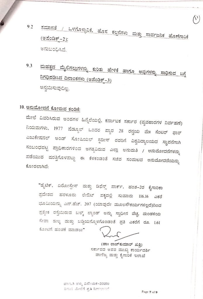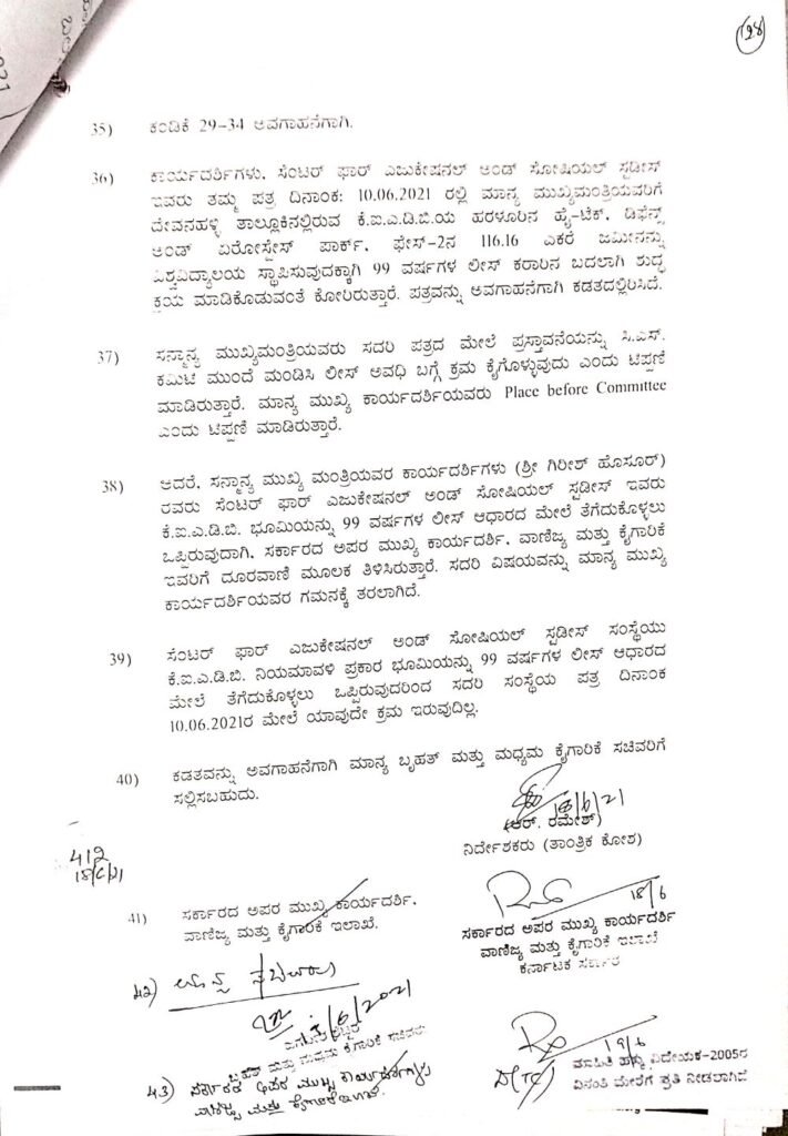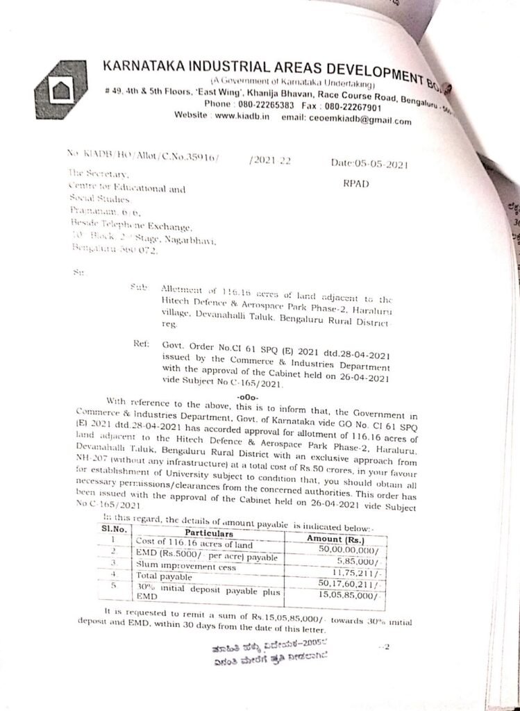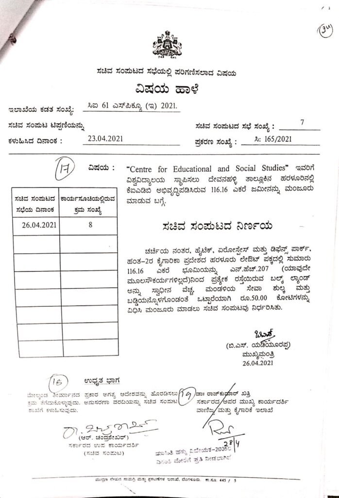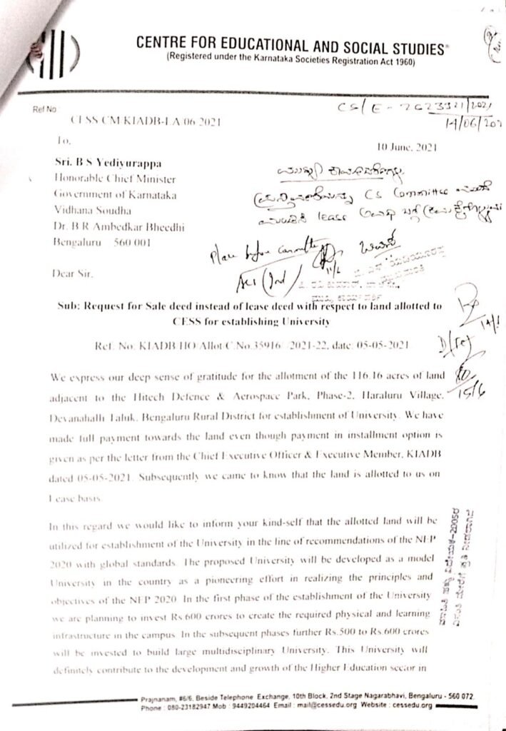 ಅಲ್ಲದೆ ಕೆಐಎಡಿಬಿ ಜಮೀನನ್ನು 99 ವರ್ಷಗಳ ಅವಧಿಗೆ ಲೀಸ್ ಆಧಾರದ ಮೇಲೆ ತೆಗೆದುಕೊಳ್ಳಲು ಸೆಂಟರ್ ಫಾರ್ ಎಜುಕೇಷನಲ್ ಅಂಡ್ ಸೋಷಿಯಲ್ ಸ್ಟಡೀಸ್ ಅವರು ಆರಂಭದಲ್ಲಿ ಒಪ್ಪಿಗೆ ಸೂಚಿಸಿತ್ತು ಎಂದು ಅಂದಿನ ಮುಖ್ಯಮಂತ್ರಿ ಯಡಿಯೂರಪ್ಪ ಅವರ ಕಾರ್ಯದರ್ಶಿಗಳಾಗಿದ್ದ ಗಿರೀಶ್ ಹೊಸೂರ್ ಅವರು ವಾಣಿಜ್ಯ ಮತ್ತು ಕೈಗಾರಿಕೆ ಇಲಾಖೆಯ ಸರ್ಕಾರದ ಹೆಚ್ಚುವರಿ ಮುಖ್ಯ ಕಾರ್ಯದರ್ಶಿಗಳಿಗೆ ದೂರವಾಣಿ ಮೂಲಕ ಗಮನಕ್ಕೆ ತಂದಿದ್ದರು. ತರುವಾಯ ಇದನ್ನು ಸರ್ಕಾರದ ಮುಖ್ಯ ಕಾರ್ಯದರ್ಶಿ ಅವರ ಗಮನಕ್ಕೂ ತರಲಾಗಿತ್ತು.