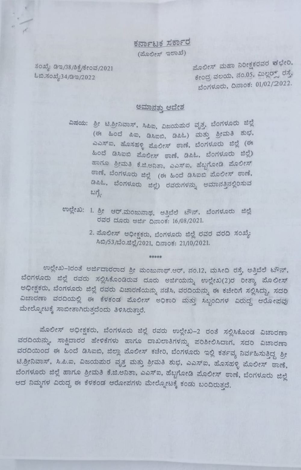 ‘ಅರ್ಜಿದಾರರಾದ ********** ಅವರು ಸಲ್ಲಿಸಿದ್ದ ದೂರು ಅರ್ಜಿಯನ್ನು ಬೆಂಗಳೂರು ಜಿಲ್ಲೆ ಪೊಲೀಸ್‌ ಅಧೀಕ್ಷಕರು ವಿಚಾರಣೆ ನಡೆಸಿ ವರದಿಯನ್ನು ಈ ಕಚೇರಿಗೆ ಸಲ್ಲಿಸಿದ್ದು ಈ ವಿಚಾರಣಾ ವರದಿಯಲ್ಲಿ ಪೊಲೀಸ್‌ ಅಧಿಕಾರಿ ಮತ್ತು ಸಿಬ್ಬಂದಿಗಳ ವಿರುದ್ಧ ಆರೋಪವು ಮೇಲ್ನೋಟಕ್ಕೆ ಸಾಬೀತಾಗಿರುತ್ತೆದೆಂದು ತಿಳಿಸಿದ್ದಾರೆ,’ಎಂಬ ಅಂಶವನ್ನು ಅಮಾನತು ಆದೇಶದಲ್ಲಿ ಪ್ರಸ್ತಾಪಿಸಲಾಗಿದೆ.