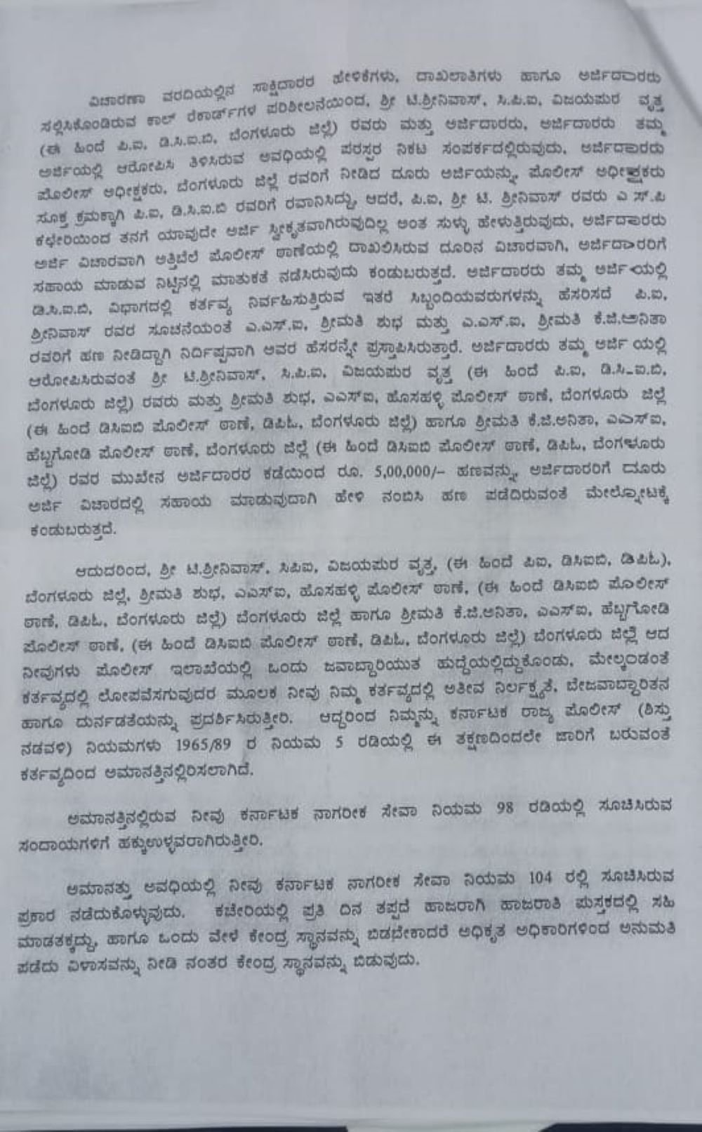ಅಲ್ಲದೆ ‘ ಪಿ ಐ ಶ್ರೀನಿವಾಸ್‌ ಅವರ ಸೂಚನೆಯಂತೆ ಎ ಎಸ್‌ ಐ ಶುಭ ಮತ್ತು ಕೆ ಜಿ ಅನಿತಾ ಅವರಿಗೆ ಹಣ ನೀಡಿದ್ದಾಗಿ ನಿರ್ದಿಷ್ಟವಾಗಿ ಹೆಸರನ್ನೇ ಪ್ರಸ್ತಾಪಿಸಿರುತ್ತಾರೆ. ಅರ್ಜಿದಾರರು ತಮ್ಮ ಅರ್ಜಿಯಲ್ಲಿ ಆರೋಪಿಸಿರುವಂತೆ ಟಿ ಶ್ರೀನಿವಾಸ್‌, ಶುಭ, ಅನಿತಾ ಅವರ ಮುಖೇನ 5,00,000 ಲಕ್ಷ ರು.ಹಣವನ್ನು ಪಡೆದು ಅರ್ಜಿ ವಿಚಾರದಲ್ಲಿ ಅರ್ಜಿದಾರರಿಗೆ ಸಹಾಯ ಮಾಡುವುದಾಗಿ ಹೇಳಿ ನಂಬಿಸಿ ಹಣ ಪಡೆದಿರುವಂತೆ ಮೇಲ್ನೋಟಕ್ಕೆ ಕಂಡು ಬಂದಿರುತ್ತದೆ, ‘ ಎಂದೂ ಅಮಾನತು ಆದೇಶದಲ್ಲಿ ಹೇಳಲಾಗಿದೆ.