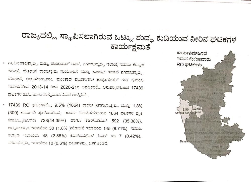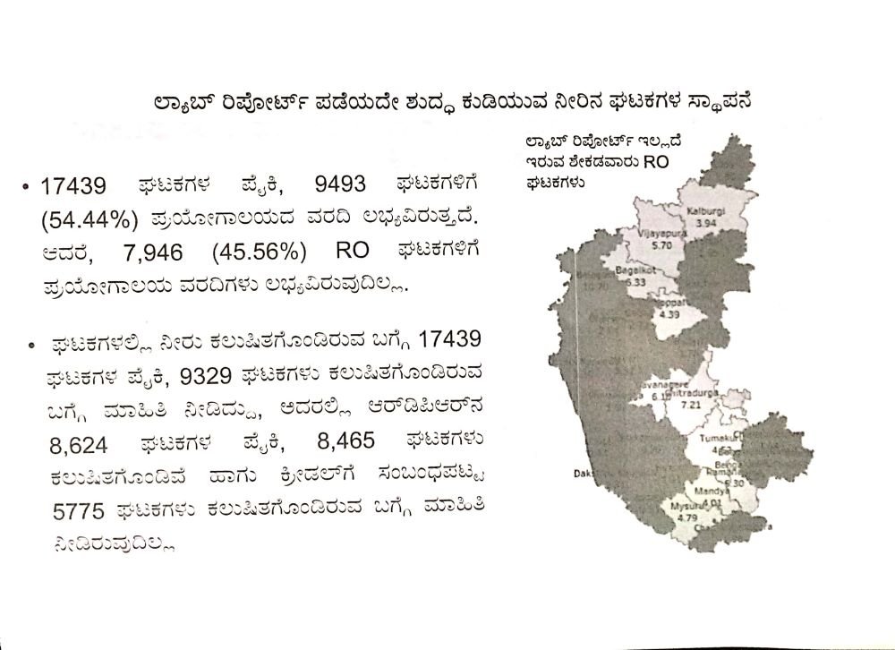 ಬೆಂಗಳೂರು; ರಾಜ್ಯದ ಗ್ರಾಮೀಣ, ನಗರ ಮತ್ತು ಪಟ್ಟಣ ಪ್ರದೇಶಗಳಲ್ಲಿ ವಿವಿಧ ಇಲಾಖೆಗಳ ಮೂಲಕ ಕಳೆದ 8 ವರ್ಷಗಳ ಅವಧಿಯಲ್ಲಿ ಪ್ರಯೋಗಾಲಯಗಳ ವರದಿಗಳನ್ನು ಪಡೆಯದೇ ಶುದ್ಧ ಕುಡಿಯುವ ನೀರಿನ ಘಟಕಗಳನ್ನು ಸ್ಥಾಪಿಸಲಾಗಿದೆ.