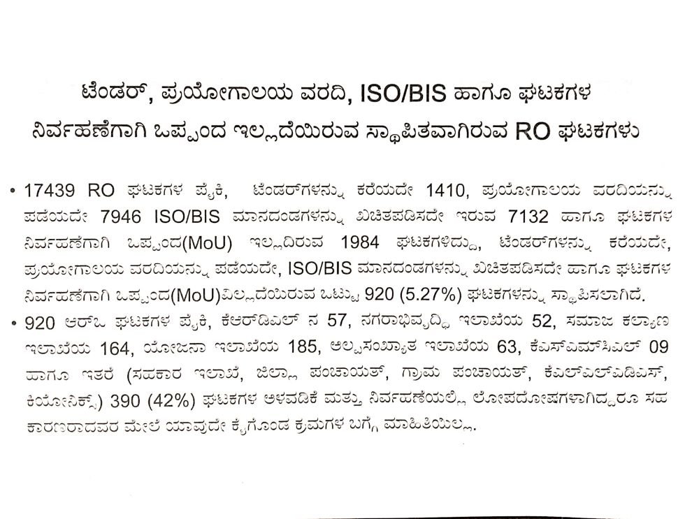 17,439 ಘಟಕಗಳ ಪೈಕಿ 1,410 ಘಟಕಗಳನ್ನು ತೆರೆಯಲು ಯಾವುದೇ ಟೆಂಡರ್ಗಳನ್ನು ಕರೆದಿಲ್ಲ. 7,132 ಘಟಕಗಳಿಗೆ ಐಎಸ್ಒ ಮತ್ತು ಬಿಐಎಸ್ ಮಾನದಂಡಗಳನ್ನು ಖಚಿತಪಡಿಸಿಲ್ಲ. ಹಾಗೂ 1,984 ಘಟಕಗಳ ನಿರ್ವಹಣೆಗಾಗಿ ಯಾವುದೇ ಒಪ್ಪಂದ (ಎಂಒಯು)ವೂ ಇಲ್ಲ . ಅಲ್ಲದೆ ಐಎಸ್ಒ, ಬಿಐಎಸ್ ಮಾನದಂಡಗಳನ್ನು ಖಚಿತಪಡಿಸದೇ ಹಾಗೂ ಘಟಕಗಳ ನಿರ್ವಹಣೆಗಾಗಿ ಒಪ್ಪಂದವಿಲ್ಲದೆಯೇ ಇರುವ ಒಟ್ಟು 920 (ಶೇ.5.27) ಘಟಕಗಳನ್ನು ಸ್ಥಾಪಿಸಲಾಗಿದೆ. 875 ಘಟಕಗಳು ಸಾಮರ್ಥ್ಯದ ಮಾಹಿತಿಯನ್ನೇ ನೀಡಿಲ್ಲ ಎಂಬುದು ವರದಿಯಿಂದ ಗೊತ್ತಾಗಿದೆ.