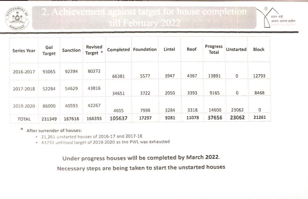 ಇನ್ನು ಫೌಂಡೇಷನ್ ಹಂತದಲ್ಲಿ 17, 297, ಲಿಂಟಲ್ ಹಂತದಲ್ಲಿ 9,281, ರೂಫ್ ಹಂತದಲ್ಲಿ 11,078 ಸೇರಿದಂತೆ ಒಟ್ಟಾರೆ 37,656 ಮನೆಗಳ ನಿರ್ಮಾಣ ಹಂತದಲ್ಲಿದೆ. ಅದೇ ರೀತಿ 23,062 ಮನೆಗಳ ನಿರ್ಮಾಣ ಕಾಮಗಾರಿ ಇನ್ನೂ ಆರಂಭವಾಗಿಲ್ಲ. 2016-17 ಮತ್ತು 2017-18ರಲ್ಲಿ ನಿಗದಿಪಡಿಸಿದ್ದ ಒಟ್ಟು ಮನೆಗಳ ಪೈಕಿ 21,261 ಮನೆಗಳನ್ನು 2022ರ ಫೆಬ್ರುವರಿವರೆಗೂ ಬ್ಲಾಕ್ ಮಾಡಿರುವುದು ತಿಳಿದು ಬಂದಿದೆ.