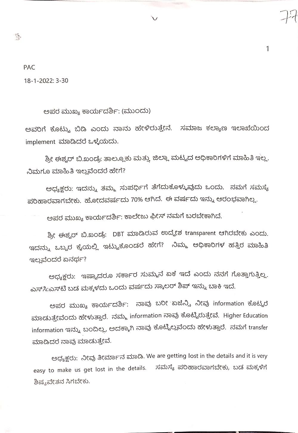 ಅದೇ ರೀತಿ ಸಮಿತಿ ಅಧ್ಯಕ್ಷ ಕೃಷ್ಣಬೈರೇಗೌಡ ಅವರು ‘ ಇಷ್ಟಾದರೂ ಸರ್ಕಾರ ಸುಮ್ಮನೆ ಏಕೆ ಇದೆ ಎಂದು ನನಗೆ ಗೊತ್ತಾಗುತ್ತಿಲ್ಲ. ಎಸ್‌ಸಿ, ಎಸ್‌ಟಿ ಬಡ ಮಕ್ಕಳದು ಒಂದು ವರ್ಷದ್ದು ಸ್ಕಾಲರ್‌ ಶಿಪ್‌ ಇನ್ನು ಬಾಕಿ ಇದೆ,’ ಎಂದು ಅಸಮಾಧಾನ ವ್ಯಕ್ತಪಡಿಸಿರುವುದು ನಡವಳಿಯಿಂದ ತಿಳಿದು ಬಂದಿದೆ.