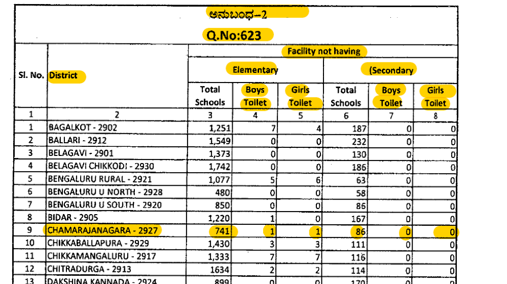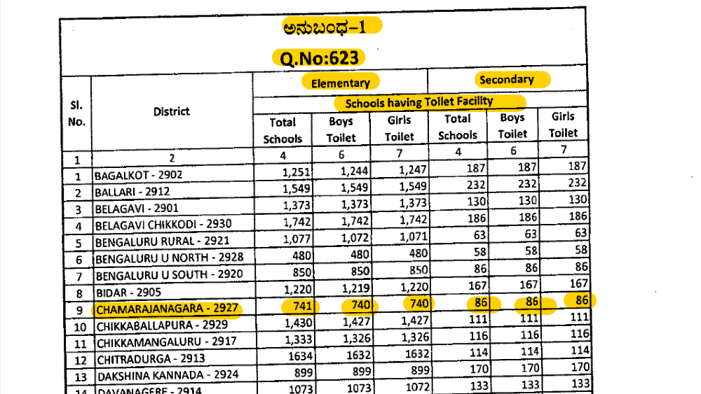 ಶಿಕ್ಷಣ ಸಚಿವ ಬಿ ಸಿ ನಾಗೇಶ್ ಅವರು ಚಾಮರಾಜನಗರ ಜಿಲ್ಲೆಯಲ್ಲಿನ 86 ಸರ್ಕಾರಿ ಪ್ರೌಢಶಾಲೆಗಳಲ್ಲಿಯೂ ಶೌಚಾಲಯಗಳು ಲಭ್ಯವಿದೆ ಎಂದು ಸದನಕ್ಕೆ ಉತ್ತರ ನೀಡಿದ್ದಾರಾದರೂ ಎಷ್ಟು ಶಾಲೆಗಳಲ್ಲಿ ಶೌಚಾಲಯಗಳ ಕೊರತೆ ಇದೆ ಎಂಬ ಸಂಖ್ಯೆಯನ್ನು ಹಂಚಿಕೊಂಡಿಲ್ಲ.
