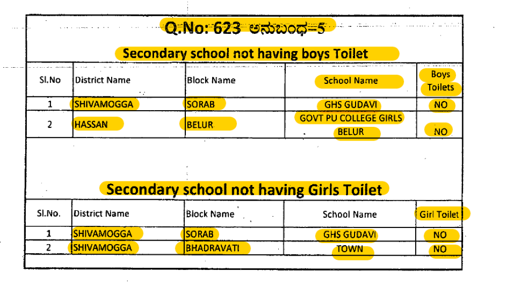 ಅಲ್ಲದೇ ಶಿವಮೊಗ್ಗದ ಸೊರಬ ತಾಲೂಕಿನ ಗುಡವಿ ಬ್ಲಾಕ್, ಹಾಸನ ಜಿಲ್ಲೆಯ ಬೇಲೂರು ಬ್ಲಾಕ್ನಲ್ಲಿ ಬಾಲಕರಿಗೆ ಮತ್ತು ಗುಡವಿ ಮತ್ತು ಭದ್ರಾವತಿ ಬ್ಲಾಕ್ನಲ್ಲಿ ಪ್ರೌಢಶಾಲೆಯ ಬಾಲಕಿಯರಿಗೆ ಶೌಚಾಲಯವಿಲ್ಲವೆಂದು ಸಚಿವ ಬಿ ಸಿ ನಾಗೇಶ್ ಅವರು ಉತ್ತರಿಸಿದ್ದಾರೆ.