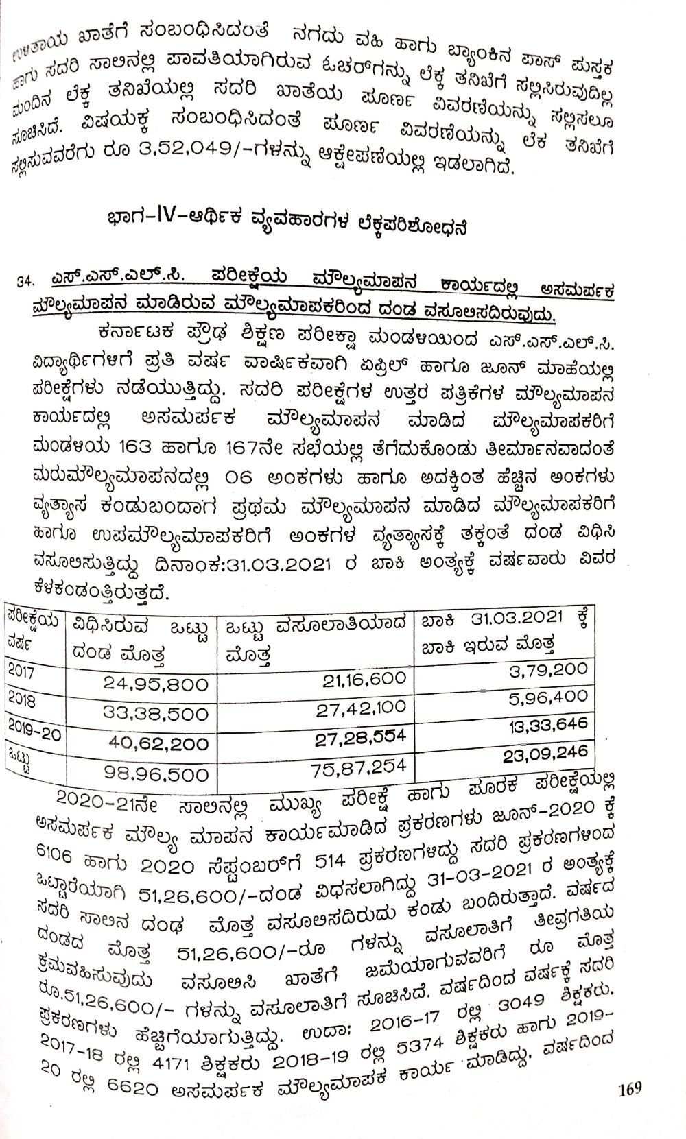 ಜುಲೈ ಮತ್ತು 2020ನೇ ಸಾಲಿನ ಎಸ್ಎಸ್ಎಲ್ಸಿ ಪರೀಕ್ಷೆಯಲ್ಲಿ ಅಸಮರ್ಪಕ ಮೌಲ್ಯಮಾಪನ ಕಾರ್ಯ ಮಾಡಿದ ಮೌಲ್ಯಮಾಪಕರಿಂದ ವಸೂಲು ಮಾಡಿರುವ ದಂಡದ ಮೊತ್ತದಲ್ಲಿ ವ್ಯತ್ಯಾಸ ಕಂಡು ಬಂದಿದೆ. ದಂಡದ ಮೊತ್ತ ವಸೂಲು ಮಾಡುವ ಶಾಖೆಯ ಲೆಕ್ಕದಂತೆ 3,49,700 ರು. ಇದ್ದರೆ ಮಂಡಳಿಯು ಲೆಕ್ಕ ಪರಿಶೋಧಕರಿಗೆ ನೀಡಿರುವ ಮಾಹಿತಿಯಂತೆ 13,18, 849 ರು. ಮತ್ತು ಸನ್ನದು ಲೆಕ್ಕ ಪರಿಶೋಧಕರ ವರದಿ ಪ್ರಕಾರ 12, 05,065 ರು. ಇದೆ ಎಂದು ಲೆಕ್ಕಪರಿಶೋಧನೆ ವರದಿಯಲ್ಲಿ ವಿವರಿಸಲಾಗಿದೆ.