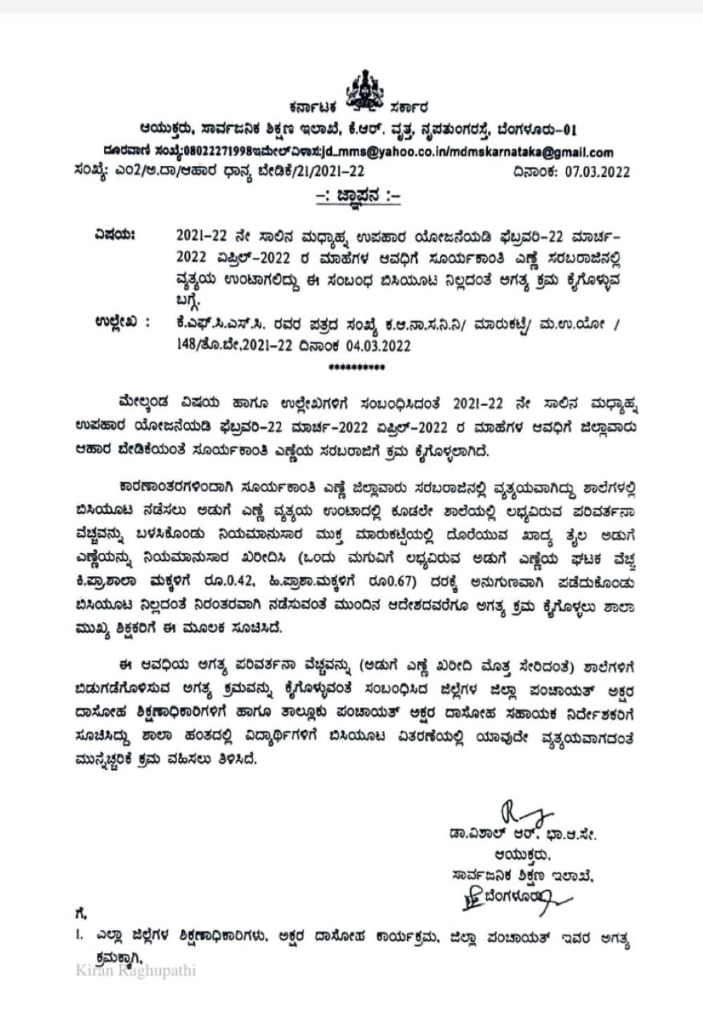 2021-22ನೇ ಸಾಲಿಗೆ ಮಧ್ಯಾಹ್ನ ಉಪಹಾರ ಯೋಜನೆಯಡಿ ಫೆ.22, ಮಾರ್ಚ್‌ 22, ಏಪ್ರಿಲ್‌ 22ರ ತಿಂಗಳಿಗೆ ಅವಧಿಗೆ ಜಿಲ್ಲಾವಾರು ಆಹಾರ ಬೇಡಿಕೆಯಂತೆ ಸೂರ್ಯಕಾಂತಿ ಎಣ್ಣೆಯ ಸರಬರಾಜಿಗೆ ಕ್ರಮಕೈಗೊಳ್ಳಲಾಗಿದೆ. ಕಾರಣಾಂತರಗಳಿಂದಾಗಿ ಸೂರ್ಯಕಾಂತಿ ಎಣ್ಣೆ ಜಿಲ್ಲಾವಾರು ಸರಬರಾಜಿನಲ್ಲಿ ವ್ಯತ್ಯಯವಾಗಿದ್ದು ಶಾಲೆಗಳಲ್ಲಿ ಬಿಸಿಯೂಟ ನಡೆಸಲು ಅಡುಗೆ ಎಣ್ಣೆಯ ವ್ಯತ್ಯಯ ಉಂಟಾದಲ್ಲಿ ಕೂಡಲೇ ಶಾಲೆಯಲ್ಲಿ ಲಭ್ಯವಿರುವ ಪರಿವರ್ತನಾ ವೆಚ್ಚವನ್ನು ಬಳಸಿಕೊಂಡು ನಿಯಮಾನುಸಾರ ಮುಕ್ತ ಮಾರುಕಟ್ಟೆಯಲ್ಲಿ ದೊರೆಯುವ ಖಾದ್ಯ ತೈಲ ಅಡುಗೆ ಎಣ್ಣೆಯನ್ನು ನಿಯಮಾನಸುರಾರ ಖರೀದಿಸಿ ( ಒಂದು ಮಗುವಿಗೆ ಲಭ್ಯವಿರುವ ಅಡುಗೆ ಎಣ್ಣೆಯ ಘಟಕ ವೆಚ್ಚ ಕಿರಿಯ ಪ್ರಾಥಮಿಕ ಶಾಲೆ ಮಕ್ಕಳಿಗೆ ರೂ.0.42 , ಹಿರಿಯ ಪ್ರಾಥಮಿಕ ಶಾಲೆ ಮಕ್ಕಳಿಗೆ 0.67 ದರಕ್ಕೆ ಅನುಗುಣವಾಗಿ ಪಡೆದುಕೊಂಡು ಬಿಸಿಯೂಟ ನಿಲ್ಲದಂತೆ ನಿರಂತರವಾಗಿ ನಡೆಸುವಂತೆ ಮುಂದಿನ ಆದೇಶದವರೆಗೂ ಅಗತ್ಯ ಕ್ರಮ ಕೈಗೊಳ್ಳಬೇಕು ಎಂದು ಶಾಲಾ ಮುಖ್ಯ ಶಿಕ್ಷಕರಿಗೆ ಸೂಚಿಸಿರುವುದು ಜ್ಞಾಪನ ಪತ್ರದಿಂದ ತಿಳಿದು ಬಂದಿದೆ.