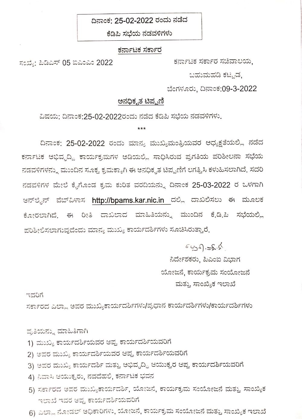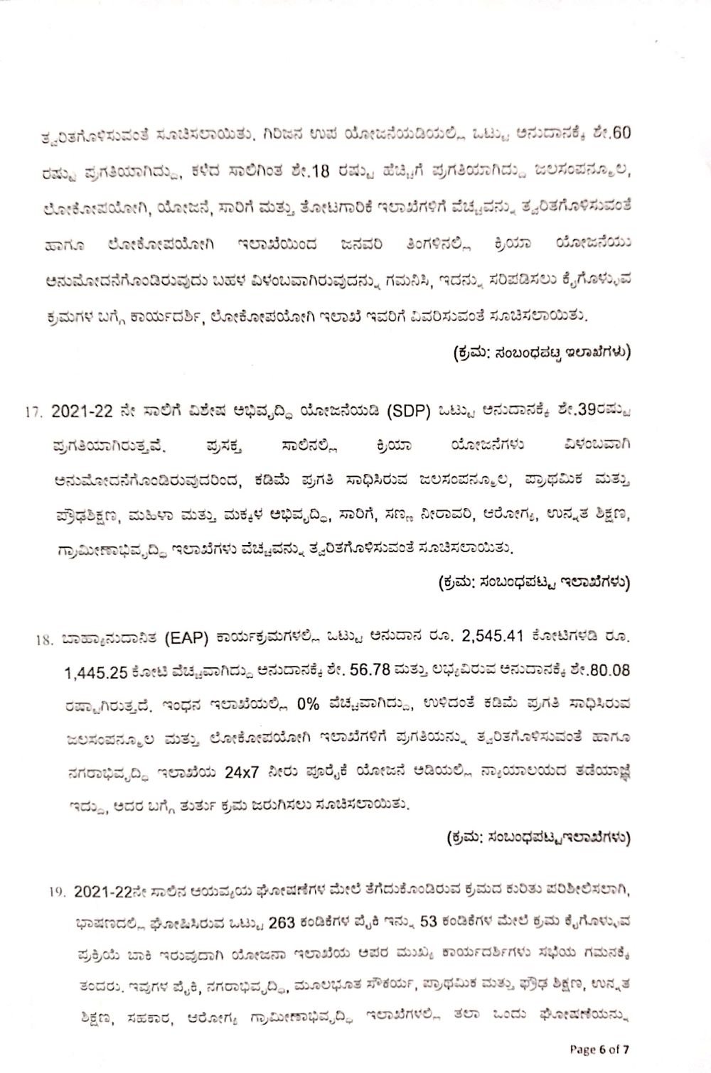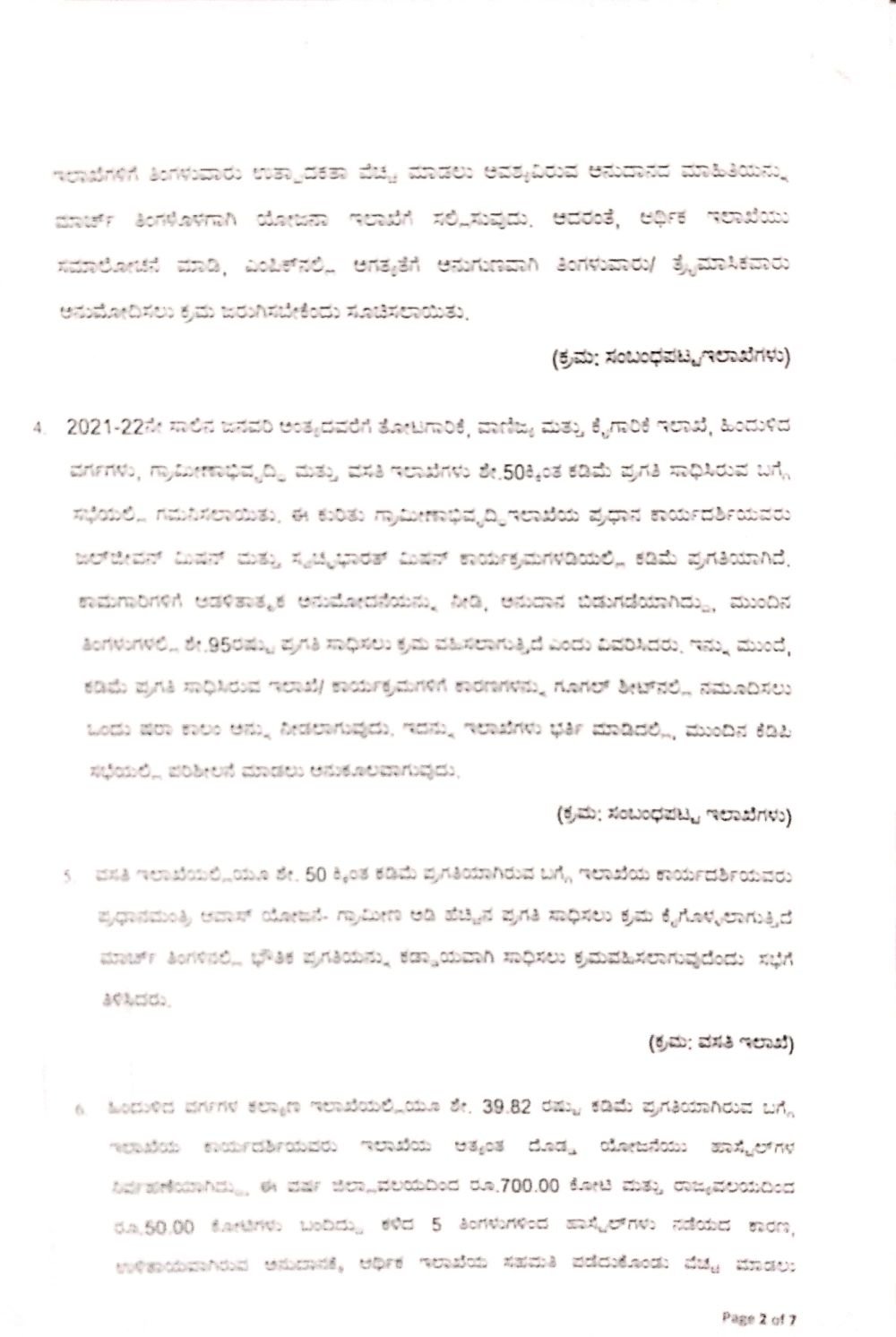 2021-22ನೇ ಸಾಲಿನ ಜನವರಿ ಅಂತ್ಯದವರೆಗೆ ತೋಟಗಾರಿಕೆ, ವಾಣಿಜ್ಯ ಕೈಗಾರಿಕೆ, ಹಿಂದುಳಿದ ವರ್ಗಗಳು, ಗ್ರಾಮೀಣಾಭಿವೃದ್ಧಿ, ವಸತಿ ಇಲಾಖೆಗಳು ಶೇ.50ಕ್ಕಿಂತ ಕಡಿಮೆ ಪ್ರಗತಿ ಸಾಧಿಸಿದೆ. ಅದರಲ್ಲೂ ತುಂಬಾ ಮುಖ್ಯವಾಗಿ ಜಲಜೀವನ್ ಮಿಷನ್ ಮತ್ತು ಸ್ವಚ್ಛ ಭಾರತ್ ಮಿಷನ್ ಕಾರ್ಯಕ್ರಮಗಳಲ್ಲಿ ಕಡಿಮೆ ಪ್ರಗತಿಯಾಗಿರುವುದು ನಡವಳಿಯಿಂದ ಗೊತ್ತಾಗಿದೆ.