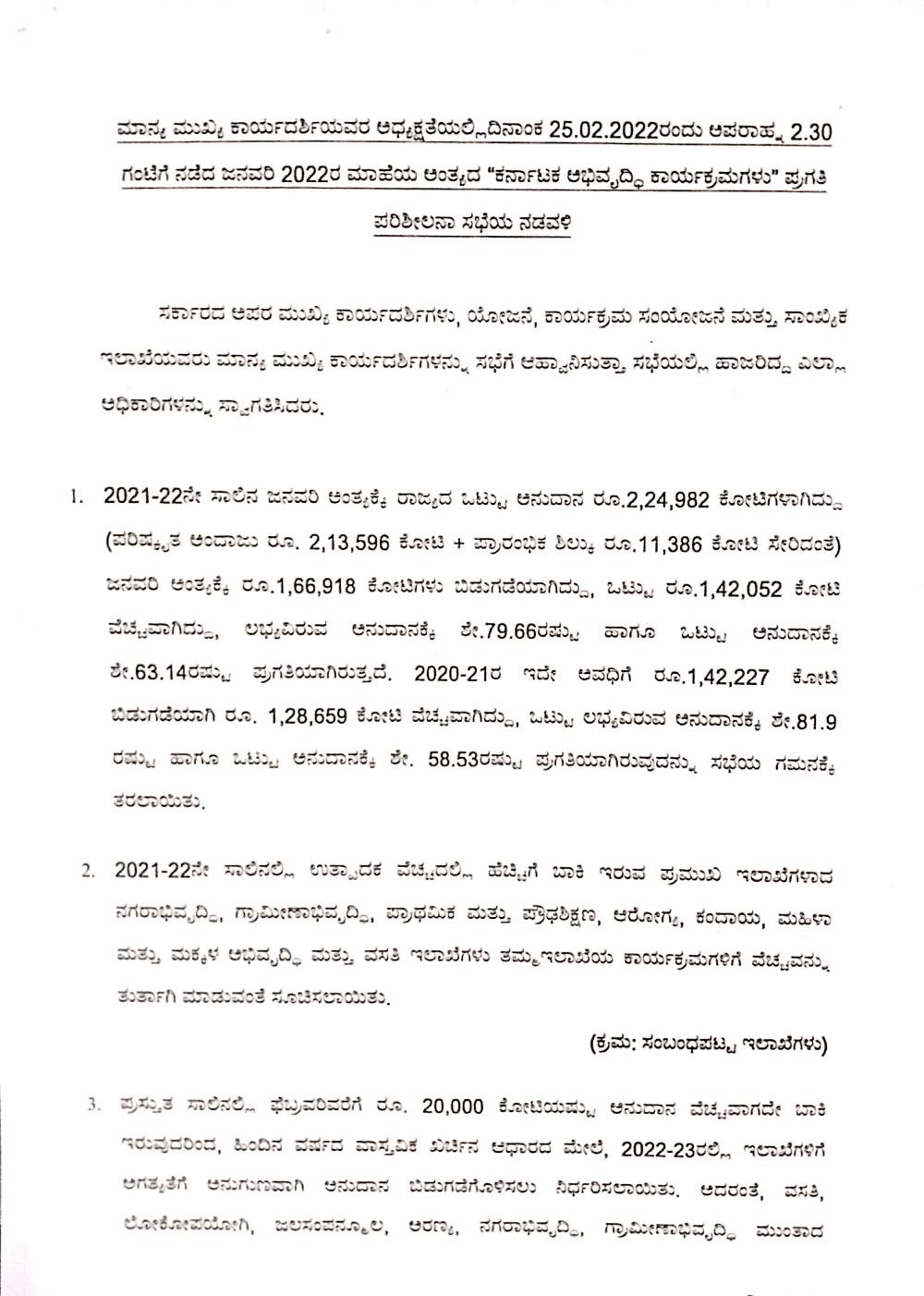 ಕರ್ನಾಟಕ ಅಭಿವೃದ್ಧಿ ಕಾರ್ಯಕ್ರಮಗಳ ಪ್ರಗತಿ ಪರಿಶೀಲನೆ ಕುರಿತು 2022ರ ಫೆ.25ರಂದು ನಡೆದಿದ್ದ ಸಭೆಯಲ್ಲಿ ಯೋಜನಾ ಇಲಾಖೆಯ ಅಧಿಕಾರಿಗಳು ವಿವಿಧ ಯೋಜನೆಗಳಿಗೆ ಒದಗಿಸಿದ್ದ ಒಟ್ಟು ಅನುದಾನದ ಪೈಕಿ 20,000 ಕೋಟಿ ರು. ವೆಚ್ಚವಾಗಿಲ್ಲ ಎಂಬ ಮಾಹಿತಿಯನ್ನು ಒದಗಿಸಿದ್ದಾರೆ. ಸಭೆ ನಡವಳಿಗಳ ಪ್ರತಿಯು ‘ದಿ ಫೈಲ್’ಗೆ ಲಭ್ಯವಾಗಿದೆ.