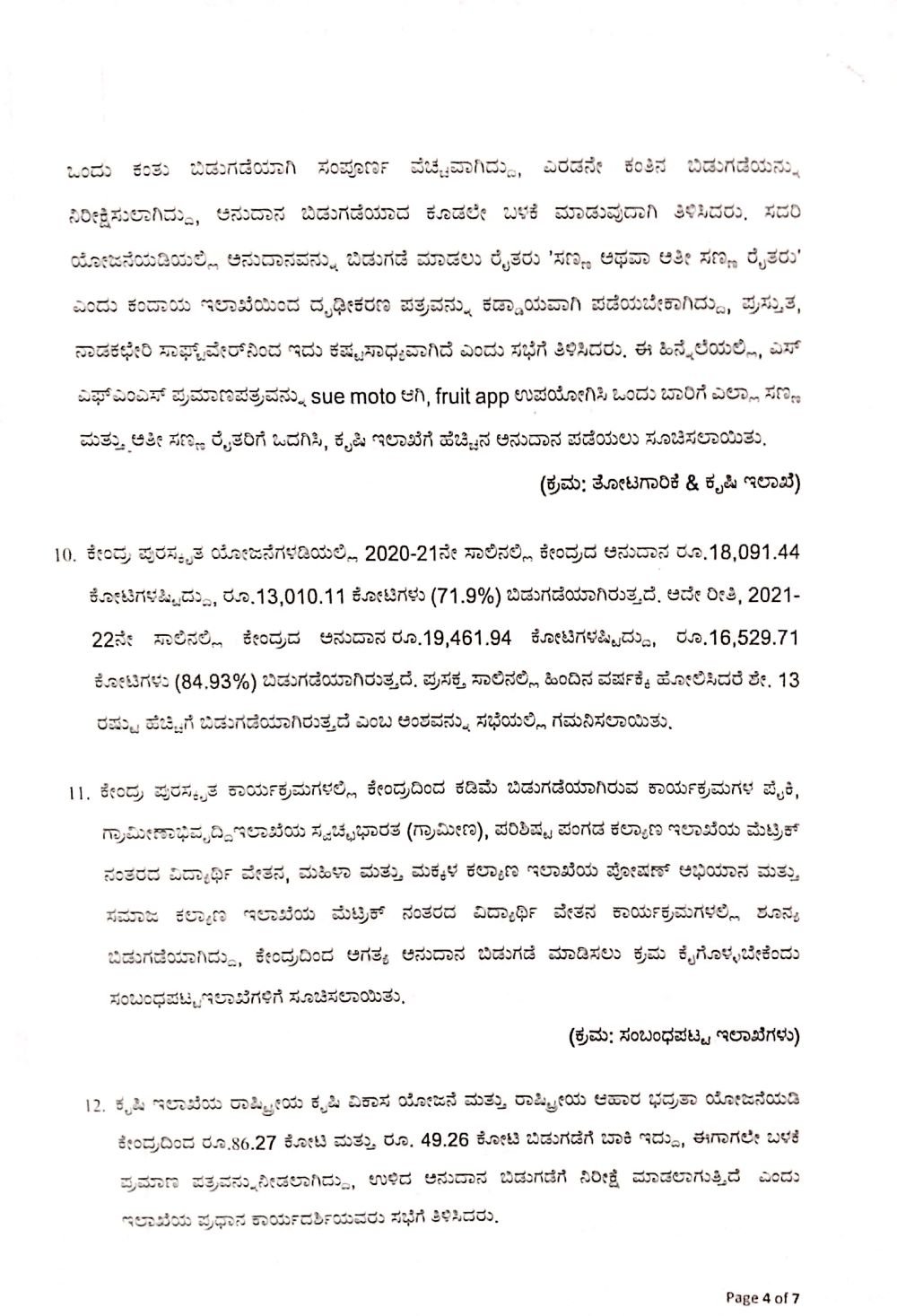 ರಾಷ್ಟ್ರೀಯ ಕೃಷಿ ವಿಕಾಸ ಯೋಜನೆ ಮತ್ತು ರಾಷ್ಟ್ರೀಯ ಆಹಾರ ಭದ್ರತೆ ಯೋಜನೆಡಿ ಕೇಂದ್ರದಿಂದ 86.27 ಕೋಟಿ ರು. ಮತ್ತು 49.26ಕೋಟಿ ರು ಬಿಡುಗಡೆಗೆ ಬಾಕಿ ಇದೆ. 2021-22ನೇ ಸಾಲಿಗೆ ವಿಶೇಷ ಅಭಿವೃದ್ಧಿ ಯೋಜನೆಯಡಿ (ಎಸ್ಡಿಪಿ) ಒಟ್ಟು ಅನುದಾನಕ್ಕೆ ಶೇ. 39 ರಷ್ಟು ಪ್ರಗತಿಯಾಗಿದೆ. ಪ್ರಸಕ್ತ ಸಾಲಿನಲ್ಲಿ ಕ್ರಿಯಾ ಯೋಜನೆಗಳು ವಿಳಂಬವಾಗಿ ಅನುಮೋದನೆಯಾಗಿರುವುದರಿಂದ ಕಡಿಮೆ ಪ್ರಗತಿ ಸಾಧಿಸಿದೆ ಎಂದು ಸಭೆಗೆ ವಿವರ ಒದಗಿಸಲಾಗಿದೆ. ಈ ಪಟ್ಟಿಯಲ್ಲಿ ಜಲ ಸಂಪನ್ಮೂಲ, ಪ್ರಾಥಮಿಕ, ಪ್ರೌಢಶಿಕ್ಷಣ, ಮಹಿಳಾ ಮತ್ತು ಮಕ್ಕಳ ಅಭಿವೃದ್ಧಿ, ಸಾರಿಗೆ, ಸಣ್ಣ ನೀರಾವರಿ, ಆರೋಗ್ಯ, ಉನ್ನತ ಶಿಕ್ಷಣ, ಗ್ರಾಮೀಣಾಭಿವೃದ್ಧಿ ಇಲಾಖೆಗಳು ಸೇರಿವೆ.