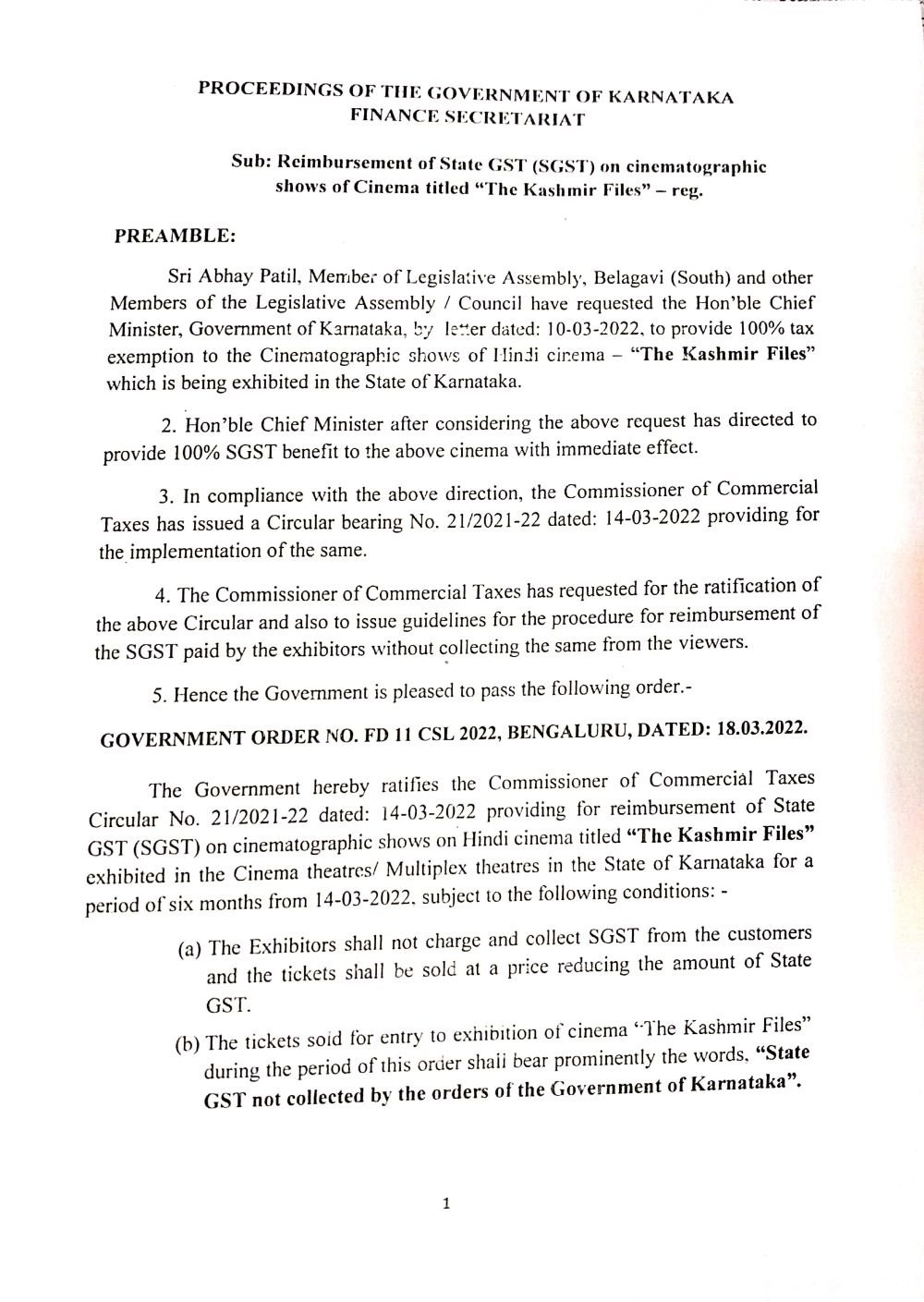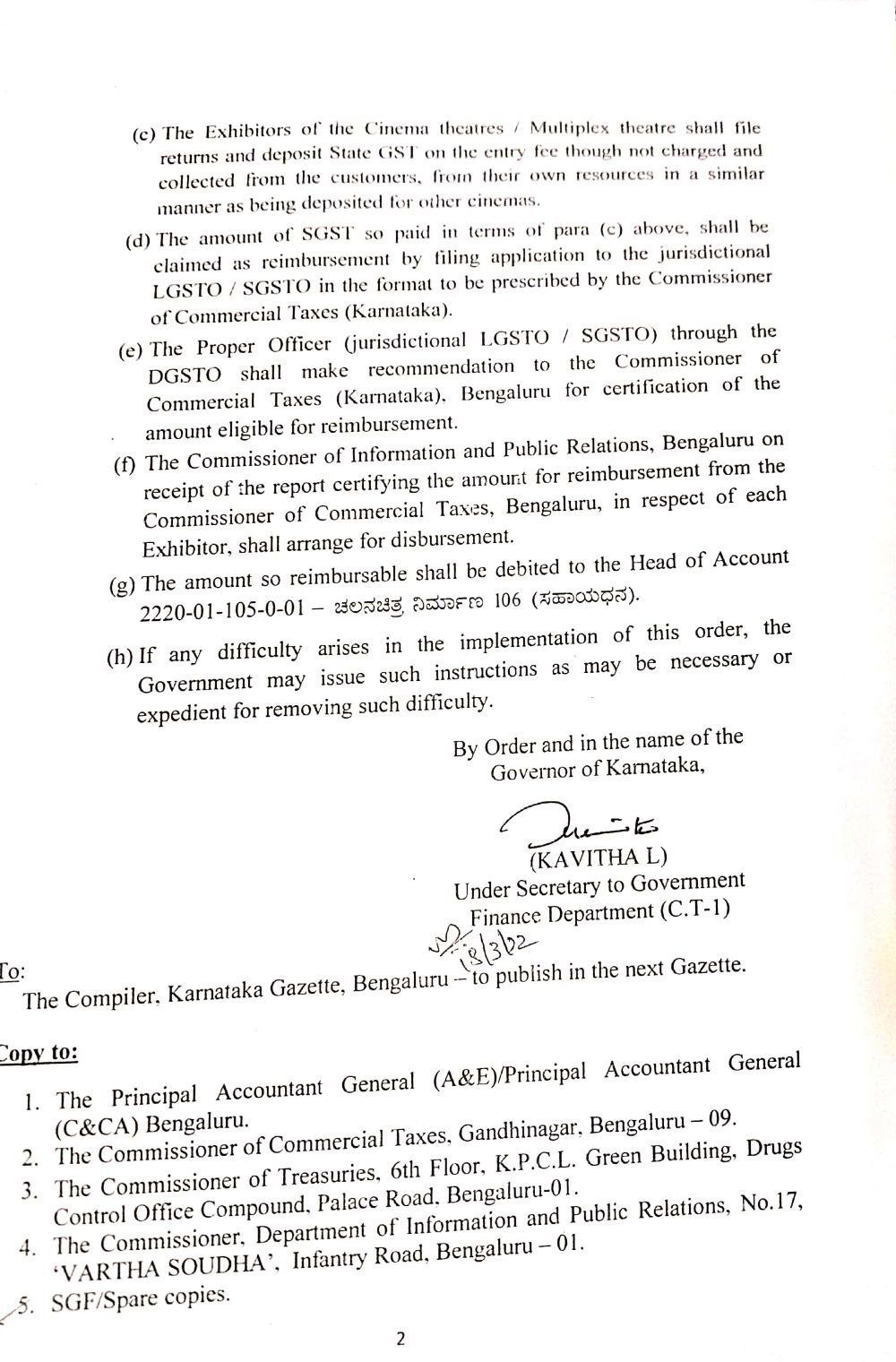 2022ರ ಮಾರ್ಚ್‌ 18ರಂದು ಆದೇಶ ಹೊರಡಿಸಿರುವ ಸರ್ಕಾರವು ಚಿತ್ರ ಪ್ರದರ್ಶಕರು ವೀಕ್ಷಕರಿಂದ ಯಾವುದೇ ತರಹದ ಎಸ್‌ಜಿಎಸ್‌ಟಿಯನ್ನು ಸಂಗ್ರಹಿಸಬಾರದು ಮತ್ತು ಜಿಎಸ್‌ಟಿ ತಗ್ಗಿಸಿದ ದರದಲ್ಲಿಯೇ ಟಿಕೆಟ್‌ಗಳನ್ನು ಮಾರಾಟ ಮಾಡಬೇಕು ಎಂದು ಸೂಚಿಸಿದೆ. ಈ ಆದೇಶದ ಪ್ರತಿ ‘ದಿ ಫೈಲ್‌’ಗೆ ಲಭ್ಯವಾಗಿದೆ.