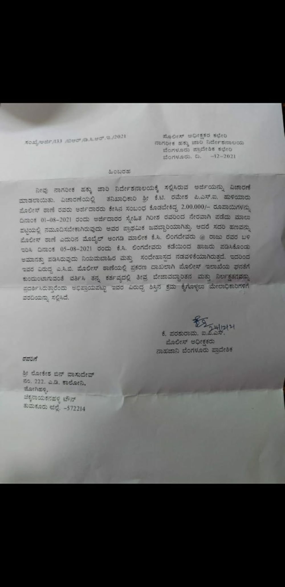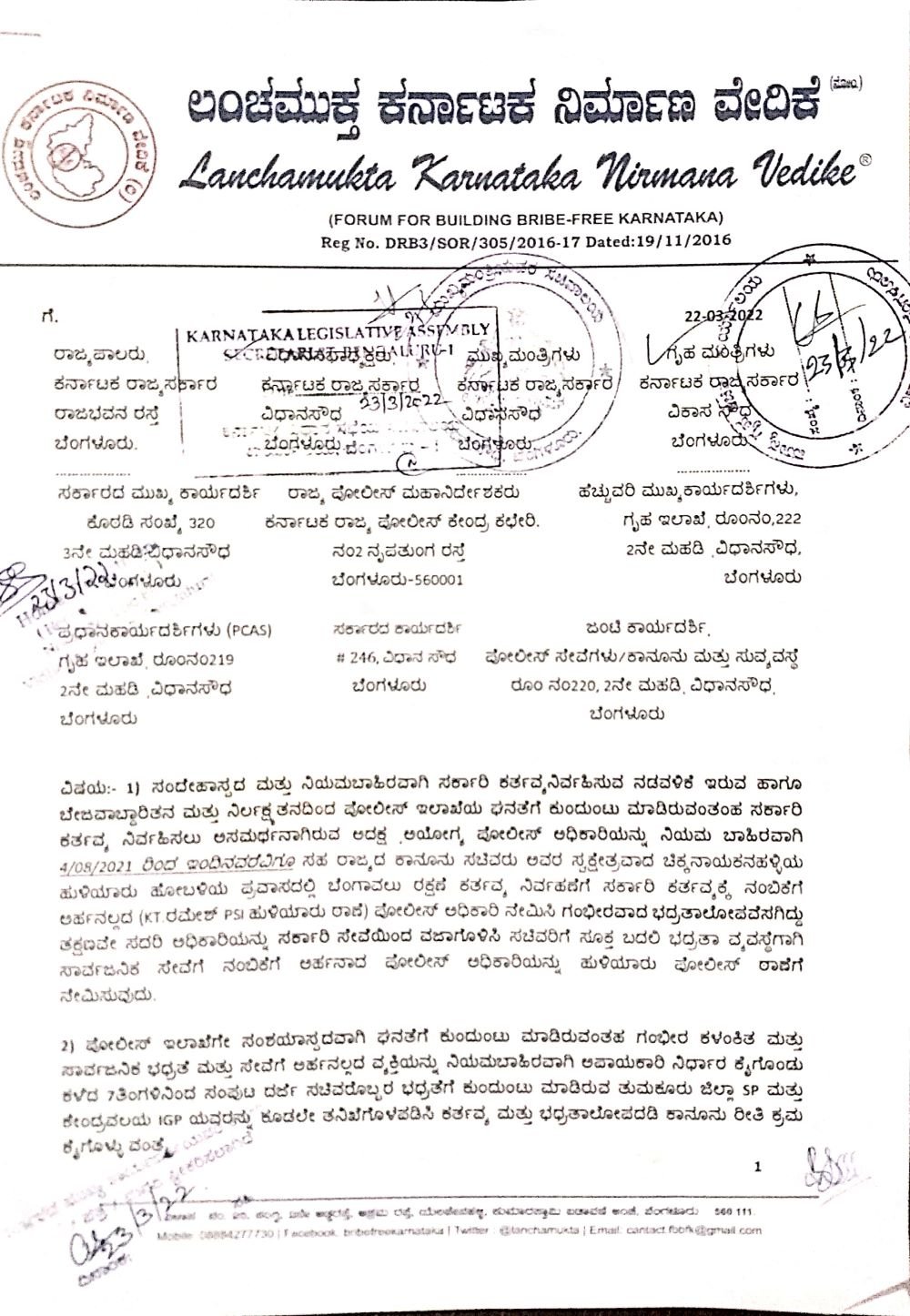 ಈ ಕುರಿತು ಲಂಚಮುಕ್ತ ಕರ್ನಾಟಕ ವೇದಿಕೆಯ ಅಧ್ಯಕ್ಷ ಮಲ್ಲಿಕಾರ್ಜುನ ಭಟ್ಟರಹಳ್ಳಿ ಎಂಬುವರು ಮುಖ್ಯಮಂತ್ರಿ, ಗೃಹ ಸಚಿವ, ಗೃಹ ಇಲಾಖೆಯ ಸರ್ಕಾರದ ಹೆಚ್ಚುವರಿ ಮುಖ್ಯ ಕಾರ್ಯದರ್ಶಿ ಸೇರಿದಂತೆ ಹಲವರಿಗೆ ದೂರರ್ಜಿ ಸಲ್ಲಿಸಿದ್ದಾರೆ. ಈ ಪತ್ರದ ಪ್ರತಿಯು ‘ದಿ ಫೈಲ್’ಗೆ ಲಭ್ಯವಾಗಿದೆ.