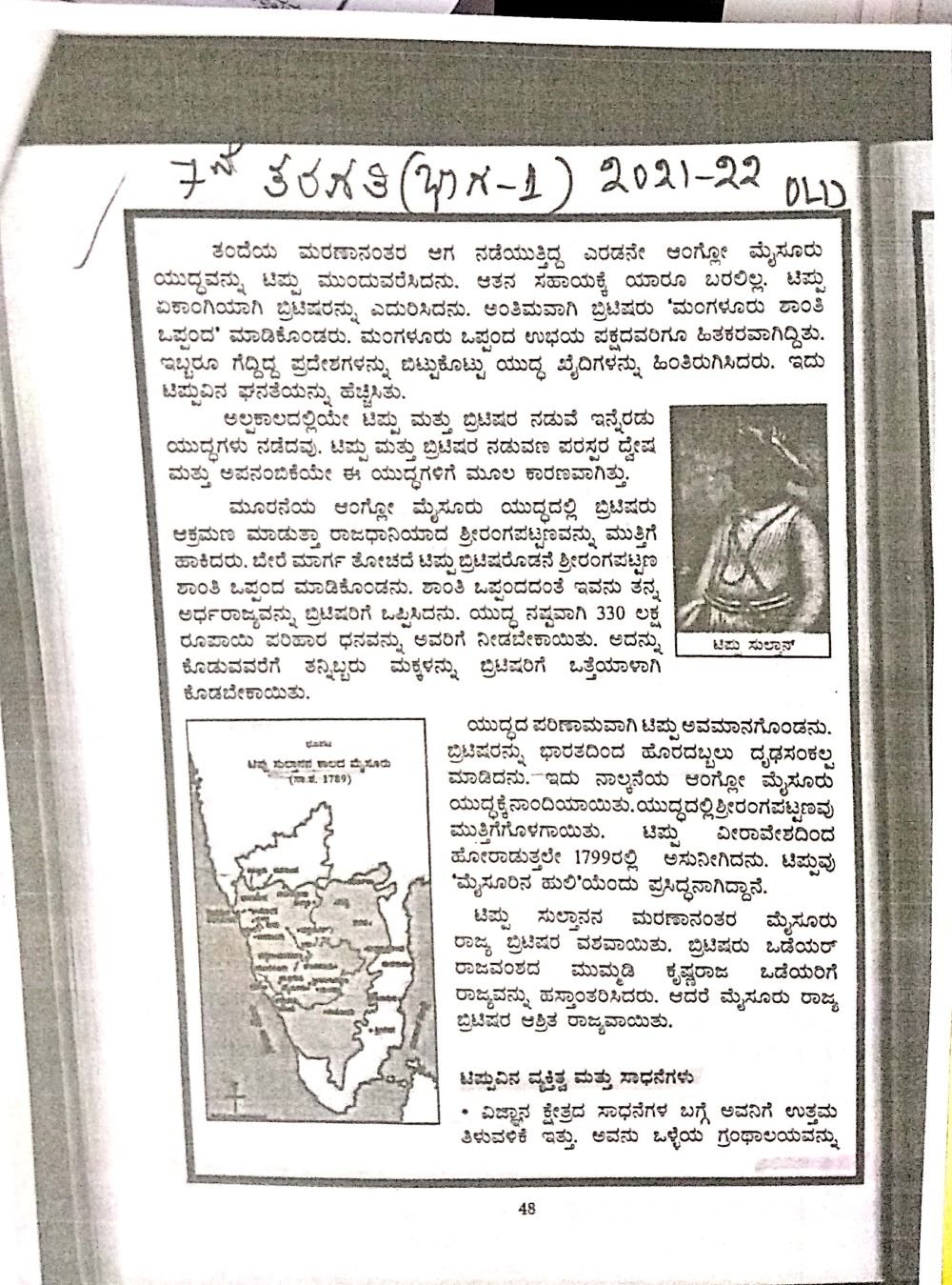 ಅಲ್ಲದೆ 2021-22ನೇ ಸಾಲಿನವರೆಗಿದ್ದ ನಮ್ಮ ಕರ್ನಾಟಕ ಚಾರಿತ್ರಿಕ ಹಿನ್ನೆಲೆಯ ಪಾಠವನ್ನೊಳಗೊಂಡ ಪುಟದಲ್ಲಿ ಟಿಪ್ಪು ಸುಲ್ತಾನ್‌ ಭಾವಚಿತ್ರವಿತ್ತು. 2022-23ನೇ ಸಾಲಿಗೆ ಪರಿಷ್ಕೃತಗೊಳಿಸಿರುವ ಸಮಿತಿಯು ಇದರಲ್ಲಿ ನಾಲ್ವಡಿ ಕೃಷ್ಣರಾಜ ಒಡೆಯರ್‌, ಸರ್‌ ಎಂ ವಿಶ್ವೇಶ್ವರಯ್ಯ, ಸರ್‌ ಮಿರ್ಜಾ ಇಸ್ಮಾಯಿಲ್‌ ಅವರ ಭಾವಚಿತ್ರಗಳನ್ನ ಉಳಿಸಿಕೊಂಡು ಟಿಪ್ಪು ಸುಲ್ತಾನ್‌ ಚಿತ್ರವನ್ನು ತೆಗೆದು ಹಾಕಿರುವುದು ಪರಿಷ್ಕೃತಗೊಳಿಸಿರುವ ಪುಟದಿಂದ ಗೊತ್ತಾಗಿದೆ.