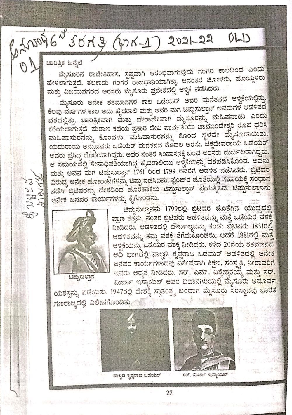 ಆರನೇ ತರಗತಿಯ (2020-21ನೇ ಸಾಲಿನವರೆಗಿದ್ದ) ‘ನಮ್ಮ ಕರ್ನಾಟಕ ಪಾಠದಲ್ಲಿ ಚಾರಿತ್ರಿಕ ಹಿನ್ನೆಲೆ’ ಅಡಿಯಲ್ಲಿ ಯದುರಾಯ ಅನ್ನುವವರು ಒಡೆಯರ್‌ ಮನೆತನದ ಮೊದಲ ಅರಸು. ಚಿಕ್ಕದೇವರಾಯ ಒಡೆಯರ್‌ ಅವರು ಪ್ರಸಿದ್ಧ ದೊರೆಯಾಗಿದ್ದರು. ಅವರ ನಂತರ ಸಿಂಹಾಸನಕ್ಕೆ ಬಂದ ಅರಸರು ದುರ್ಬಲರಾಗಿದ್ದರು. ಈ ಸಮಯದಲ್ಲಿ ಸೇನಾಧಿಪತಿಯಾಗಿದ್ದ ಹೈದರಾಲಿಯು ಆಳ್ವಿಕೆಯನ್ನು ವಶಪಡಿಸಿಕೊಂಡ ಎಂಬ ಅಂಶವಿತ್ತು.