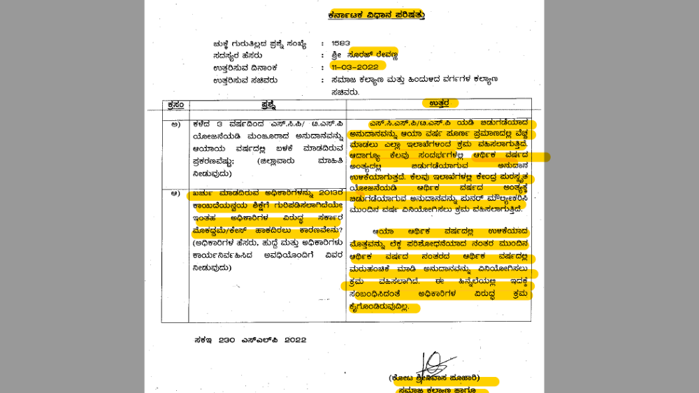 ‘ಆಯಾ ಆರ್ಥಿಕ ವರ್ಷದಲ್ಲಿ ಉಳಿಕೆಯಾದ ಮೊತ್ತವನ್ನು ಲೆಕ್ಕ ಪರಿಶೋಧನೆಯಾದ ನಂತರ ಮುಂದಿನ ಆರ್ಥಿಕ ವರ್ಷದ ನಂತರದ ಆರ್ಥಿಕ ವರ್ಷದಲ್ಲಿ ಮರು ಹಂಚಿಕೆ ಮಾಡಿ ಅನುದಾನವನ್ನು ವಿನಿಯೋಗಿಸಿಲು ಕ್ರಮ ವಹಿಸಲಾಗಿದೆ. ಈ ಹಿನ್ನೆಲೆಯಲ್ಲಿ ಇದಕ್ಕೆ ಸಂಬಂಧಿಸಿದಂತೆ ಅಧಿಕಾರಿಗಳ ವಿರುದ್ಧ ಕ್ರಮ ಕೈಗೊಂಡಿರುವುದಿಲ್ಲ,’ ಎಂದು ಸಮಾಜ ಕಲ್ಯಾಣ ಸಚಿವ ಕೋಟ ಶ್ರೀನಿವಾಸ ಪೂಜಾರಿ ಅವರು ಉತ್ತರಿಸಿದ್ದಾರೆ.