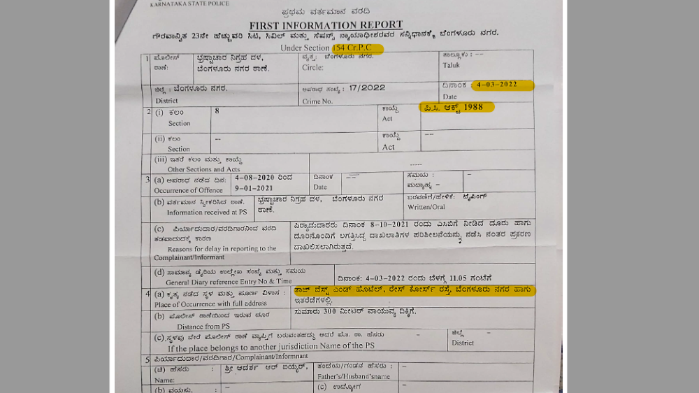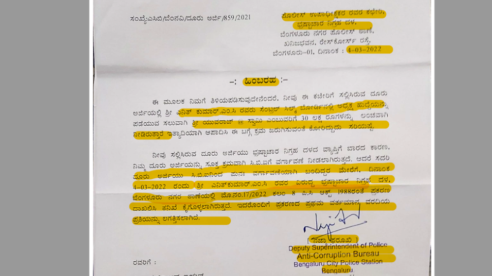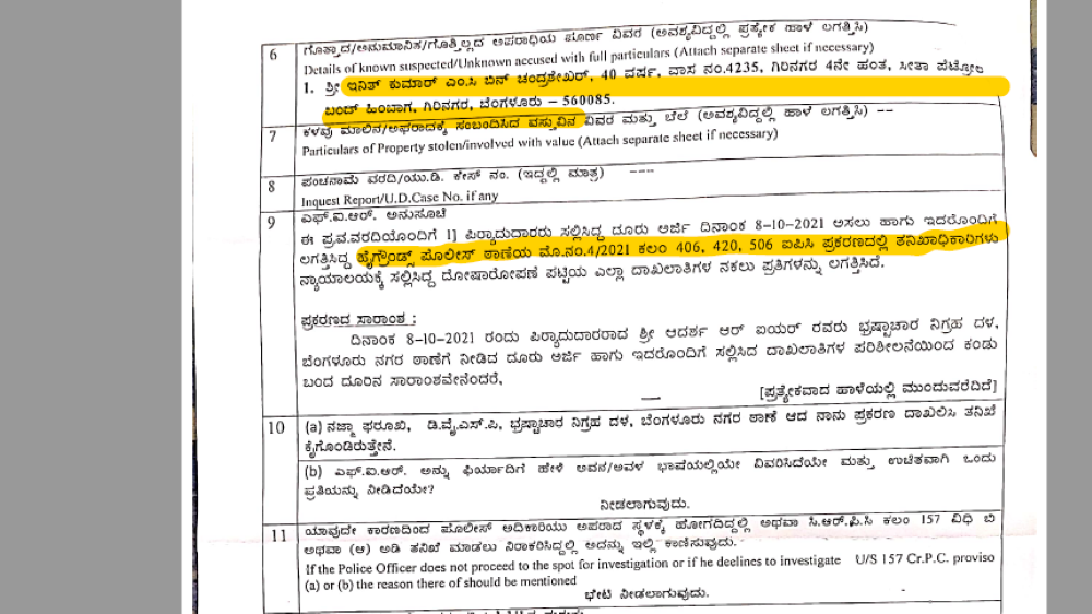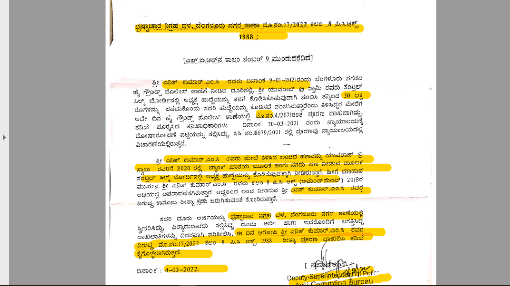 ಹೀಗಾಗಿ ಎಸಿಬಿಯು ಅನಿವಾರ್ಯವಾಗಿ  ಎನಿತ್‌ಕುಮಾರ್‌ ವಿರುದ್ಧ  2022ರ ಮಾರ್ಚ್‌ 4ರಂದು ಭ್ರಷ್ಟಾಚಾರ ತಡೆ ಕಾಯ್ದೆ ಅನ್ವಯ ಎಫ್‌ಐಆರ್‌ ದಾಖಲಿಸಿದೆ. ಎಸಿಬಿಯು ದಾಖಲಿಸಿರುವ ಎಫ್‌ಐಆರ್‌ ಪ್ರತಿಯು ‘ದಿ ಫೈಲ್‌’ಗೆ ಲಭ್ಯವಾಗಿದೆ.