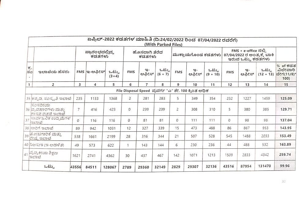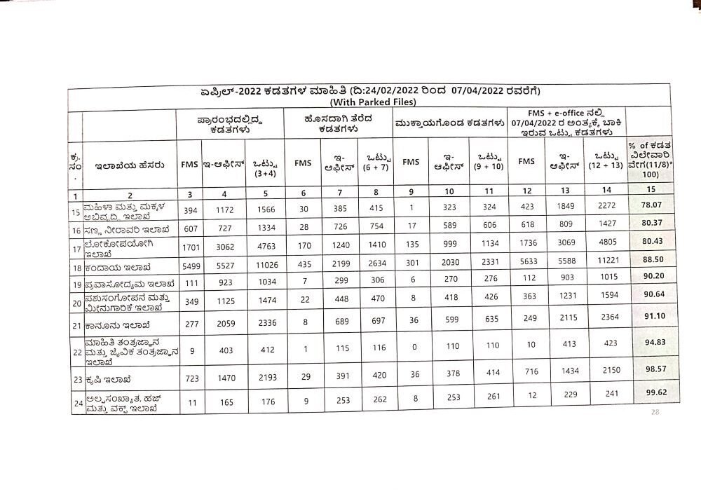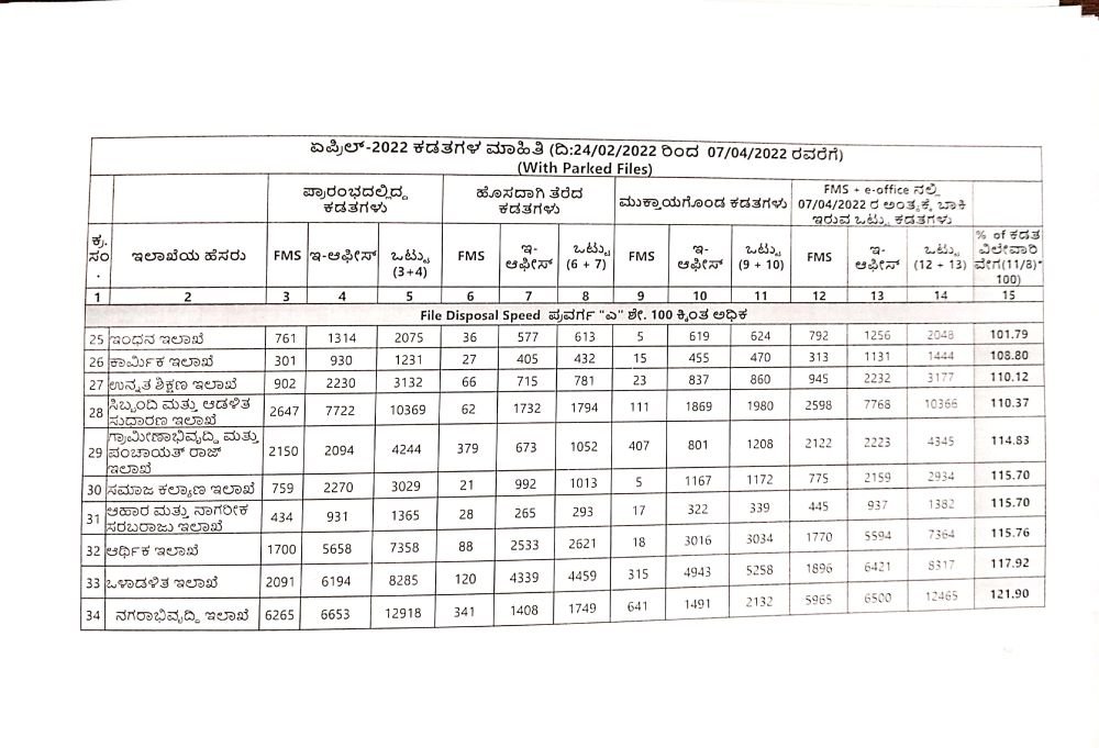 ಕಡತಗಳ ವಿಲೇವಾರಿಗೆ ಸಂಬಂಧಿಸಿದಂತೆ 12 ಇಲಾಖೆಗಳು ‘ಸಿ’ ವರ್ಗದಲ್ಲಿದ್ದರೆ, 35 ಇಲಾಖೆಗಳು ‘ಬಿ’ ವರ್ಗ, ಇನ್ನುಳಿದ 6 ಇಲಾಖೆಗಳು ಮಾತ್ರ ‘ಎ’ ವರ್ಗದಲ್ಲಿವೆ. ಬೇರೆ ಬೇರೆ ಇಲಾಖೆಗಳಿಗೆ ಕಳಿಸಿರುವ 1,31,470 ಕಡತಗಳ ಪೈಕಿ ಎಫ್ಎಂಎಸ್ನಲ್ಲಿ 43,516 ಕಡತಗಳು ಎಫ್ಎಂಎಸ್ನಲ್ಲಿದ್ದರೆ ಇ-ಆಫೀಸ್ನಲ್ಲಿ 87,954 ಕಡತಗಳು ಬಾಕಿ ಇವೆ.