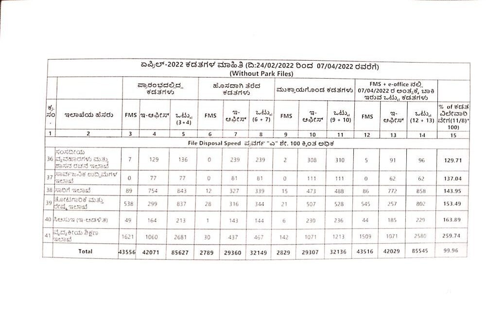 ಇಲಾಖೆ ಹಂತದಲ್ಲೇ ಇರುವ 85,545 ಕಡತಗಳ ಪೈಕಿ 43,516 ಕಡತಗಳು ಎಫ್ಎಂಎಸ್ನಲ್ಲಿ ಬಾಕಿ ಇದ್ದರೆ ಇನ್ನುಳಿದ 42,209 ಕಡತಗಳು ಇ-ಆಫೀಸ್ ನಲ್ಲಿ ಇಲಾಖಾ ಹಂತದಲ್ಲೇ ಬಾಕಿ ಉಳಿದಿವೆ.