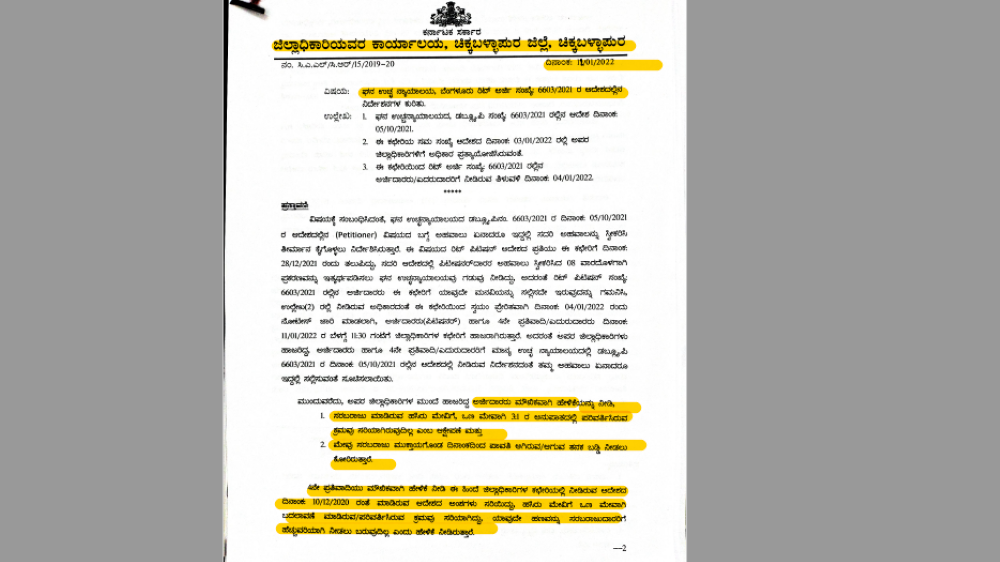 ಅಷ್ಟೇ ಅಲ್ಲ, ‘3 ಕೆ ಜಿ ಹಸಿರು ಮೇವನ್ನು 1 ಕೆ ಜಿ ಒಣ ಮೇವಾಗಿ ಪರಿಗಣಿಸಲು ತೆಗೆದುಕೊಂಡಿರುವ ತೀರ್ಮಾನವು ಸರಿ ಇದ್ದು, ಅದರಂತೆ 3;1ರ ಅನುಪಾತದಲ್ಲಿ ಪರಿಗಣಿಸಲು ಸೂಕ್ತವೆಂದು ಅಭಿಪ್ರಾಯ ಪಡಲಾಗಿದೆ. ಅರ್ಜಿದಾರರು ಸರಬರಾಜು ಮಾಡಿರುವ ಹಸಿರು ಮೇವಿಗೆ ಒಣ ಮೇವಾಗಿ 3;1ರ ಅನುಪಾತದಲ್ಲಿ ಪರಿವರ್ತಿಸಿರುವ ಕ್ರಮವು ಸರಿಯಾಗಿರುವುದಿಲ್ಲ. ಮತ್ತು ಹೆಚ್ಚುವರಿಯಾಗಿ ಅರ್ಜಿದಾರರಿಗೆ ಪಾವತಿಗೆ ಯಾವುದೇ ಮೊಬಲಗು ಬಾಕಿ ಇರದ ಕಾರಣ ಮೇವು ಸರಬರಾಜು ಮುಕ್ತಾಯಗೊಂಡ ದಿನಾಂಕದಿಂದ ಪಾವತಿ ಆಗಿರುವ ಮತ್ತು ಆಗುವ ತನಕ ಬಡ್ಡಿ ನೀಡಲು ಮೌಖಿಕವಾಗಿ ಕೋರಿರುವ ಬೇಡಿಕೆಯನ್ನು ತಿರಸ್ಕರಿಸಲಾಗಿದೆ,’ ಎಂದು ಚಿಕ್ಕಬಳ್ಳಾಪುರದ ಅಪರ ಜಿಲ್ಲಾಧಿಕಾರಿ ಅವರು 2022ರ ಜನವರಿ 12ರಂದು ಆದೇಶ ಹೊರಡಿಸಿದ್ದಾರೆ.