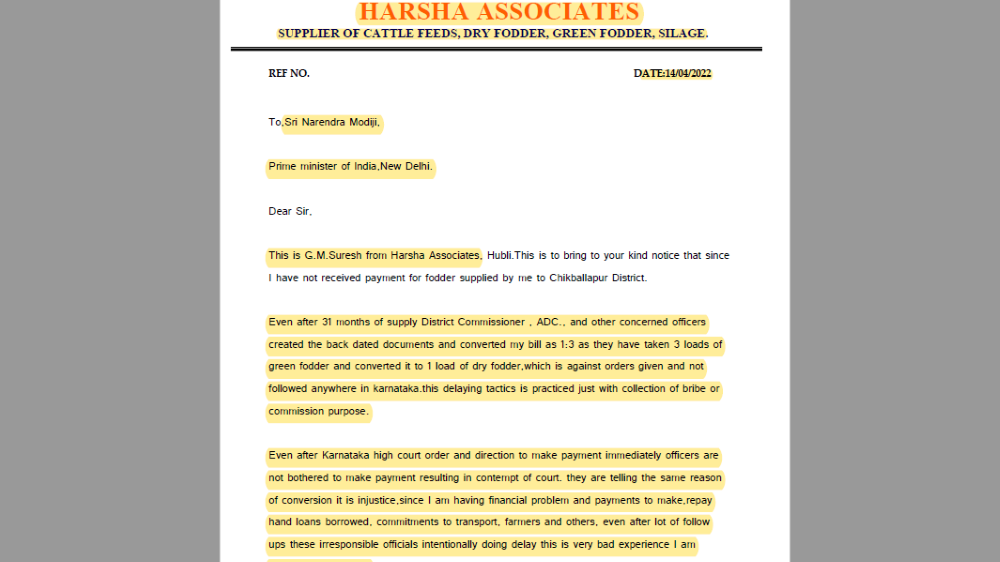 ‘ಸರಬರಾಜುದಾರರು 3 ಲೋಡ್ನ್ನು ಮೇವನ್ನು ಸರಬರಾಜು ಮಾಡಿದ್ದರೂ ಲಂಚ ಮತ್ತು ಕಮಿಷನ್ ನೀಡದ ಕಾರಣಕ್ಕೆ ಅದನ್ನು ಒಂದು ಲೋಡ್ಗೆ ಪರಿವರ್ತಿಸಿದ್ದಾರೆ. ಇದು ಅನ್ಯಾಯ. ಕಮಿಷನ್ ಮತ್ತು ಲಂಚ ಕೊಡದಿರುವ ಸರಬರಾಜುದಾರರಿಗೆ ಮಾತ್ರ ಇಂತಹ ಅನ್ಯಾಯವಾಗುತ್ತಿದೆ. ಬಾಕಿ ಹಣವನ್ನು ಪಾವತಿಸಲು ಅನಗತ್ಯ ವಿಳಂಬ ಮಾಡಲಾಗುತ್ತಿದೆಯಲ್ಲದೆ ಕಮಿಷನ್, ಲಂಚ ಕೊಡದ ಸರಬರಾಜುದಾರರನ್ನು ಆರ್ಥಿಕ ಸಂಕಷ್ಟಕ್ಕೆ ದೂಡಲಾಗುತ್ತಿದೆ. ಸಾಲಸೋಲ ಮಾಡಿ ಮೇವು ಸರಬರಾಜು ಮಾಡಿರುವ ಸರಬರಾಜುದಾರರಿಗೆ ಅತ್ಮಹತ್ಯೆಯೊಂದೇ ದಾರಿ,’ ಎಂದು ಜಿ ಎಂ ಸುರೇಶ್ ಎಂಬುವರು ಪ್ರಧಾನಿಗೆ ಬರೆದಿರುವ ದೂರಿನಲ್ಲಿ ವಿವರಿಸಿದ್ದಾರೆ.