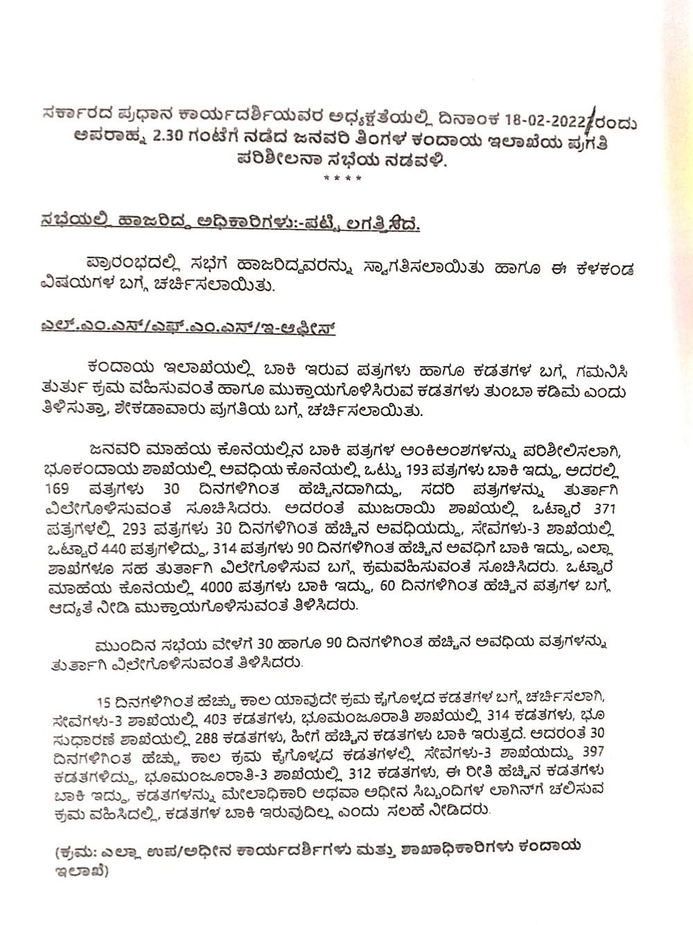 ಅಲ್ಲದೆ ಕಡತಗಳು 15 ದಿನಗಳಿಗಿಂತಲು ಹೆಚ್ಚು ಕಾಲ ಯಾವುದೇ ಕ್ರಮ ಕೈಗೊಳ್ಳದ ಕಡತಗಳ ಕುರಿತು 2022ರ ಫೆ.18ರಂದು ಇಲಾಖೆಯ ಸರ್ಕಾರದ ಪ್ರಧಾನ ಕಾರ್ಯದರ್ಶಿ ತುಷಾರ್ ಗಿರಿನಾಥ್ ಅವರ ಅಧ್ಯಕ್ಷತೆಯಲ್ಲಿ ಸಭೆ ನಡೆದಿತ್ತು. ‘ 15 ದಿನಗಳಿಗಿಂತ ಹೆಚ್ಚು ಕಾಲ ಯಾವುದೇ ಕ್ರಮ ಕೈಗೊಳ್ಳದ ಕಡತಗಳ ಕುರಿತು ಚರ್ಚಿಸಲಾಗಿದೆ. ಸೇವೆಗಳು (3) ಶಾಖೆಯಲ್ಲಿ 403, ಭೂ ಮಂಜೂರಾತಿ ಶಾಖೆಯಲ್ಲಿ 314, ಭೂ ಸುಧಾರಣೆ ಶಾಖೆಯಲ್ಲಿ 288 ಸೇರಿದಂತೆ ಹೆಚ್ಚಿನ ಸಂಖ್ಯೆಯಲ್ಲಿ ಕಡತಗಳು ಬಾಕಿ ಇದೆ. ಅದರಂತೆ 30 ದಿನಗಳಿಗಿಂತಲೂ ಹೆಚ್ಚು ಕಾಲ ಕ್ರಮ ಕೈಗೊಳ್ಳದೇ ಇರುವ ಕಡತಗಳ ಪೈಕಿ ಸೇವೆಗಳು(3) ಶಾಖೆಯಲ್ಲಿವೆ,’ ಎಂಬ ವಿವರವು ಸಭೆ ನಡವಳಿಯಿಂದ ತಿಳಿದು ಬಂದಿದೆ.