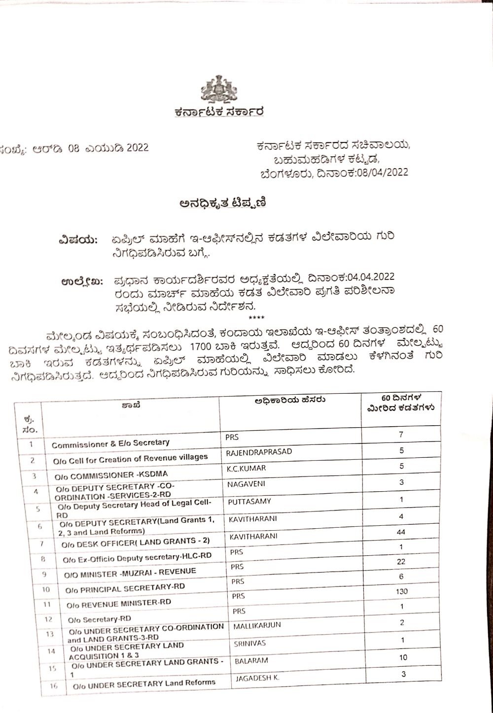 ‘ಕಂದಾಯ ಇಲಾಖೆಯ ಇ-ಆಫೀಸ್ ತಂತ್ರಾಂಶದಲ್ಲಿ 60 ದಿವಸಗಳ ಮೇಲ್ಪಟ್ಟು ಇತ್ಯರ್ಥಪಡಿಸಲು ಒಟ್ಟು 1,700 ಕಡತಗಳು ಬಾಕಿ ಇವೆ. ಹೀಗಾಗಿ 60 ದಿನಗಳ ಮೇಲ್ಪಟ್ಟು ಬಾಕಿ ಇರುವ ಕಡತಗಳನ್ನು ಏಪ್ರಿಲ್ ತಿಂಗಳಿನಲ್ಲೇ ವಿಲೇವಾರಿ ಮಾಡಲು ನಿಗದಿಪಡಿಸಿರುವ ಗುರಿಯನ್ನು ಸಾಧಿಸಬೇಕು,’ ಎಂದು ನಿರ್ದೇಶಕ ಡಾ ರಾಜೇಂದ್ರಪ್ರಸಾದ್ ಅವರು ಇಲಾಖೆಯ ಉಪ ಕಾರ್ಯದರ್ಶಿಗಳಿಗೆ ಕೋರಿದ್ದಾರೆ.