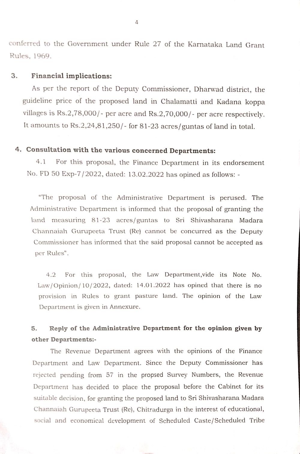 ಆರ್ಥಿಕ ಮತ್ತು ಕಾನೂನು ಇಲಾಖೆಯು ನೀಡಿರುವ ಎರಡೂ ಅಭಿಪ್ರಾಯಗಳನ್ನು ಕಂದಾಯ ಇಲಾಖೆಯು ಒಪ್ಪಿದೆ. ಆದರೂ 81.23 ಎಕರೆ ಮಂಜೂರು ಮಾಡುವ ಸಂಬಂಧ ತೀರ್ಮಾನ ಕೈಗೊಳ್ಳಲು ಸಚಿವ ಸಂಪುಟದ ಹೆಗಲಿಗೆ ವರ್ಗಾಯಿಸಿ ಕೈತೊಳೆದುಕೊಂಡಿರುವುದು ಪ್ರಸ್ತಾವನೆಯಿಂದ ತಿಳಿದು ಬಂದಿದೆ.