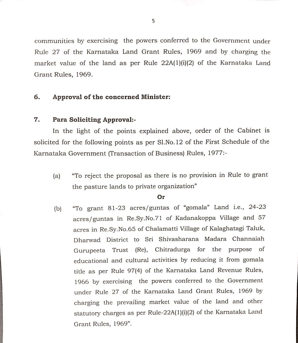 81.23 ಎಕರೆ ವಿಸ್ತೀರ್ಣ ಹೊಂದಿರುವ ಹುಲ್ಲುಗಾವಲು ಪ್ರದೇಶವನ್ನು ಮಂಜೂರು ಮಾಡುವುದಕ್ಕೆ ಸಂಬಂಧಿಸಿದಂತೆ ಕಂದಾಯ ಇಲಾಖೆಯು ಸ್ಪಷ್ಟ ನಿಲುವು ತಾಳಿಲ್ಲ. ಹುಲ್ಲುಗಾವಲು ಪ್ರದೇಶವನ್ನು ಮಂಜೂರು ಮಾಡಲು ಕಾಯ್ದೆಯಲ್ಲಿ ಅವಕಾಶವಿಲ್ಲ. ಹೀಗಾಗಿ ಪ್ರಸ್ತಾವನೆಯನ್ನು ತಿರಸ್ಕರಿಸಬಹದು ಎಂದು ಪ್ರಸ್ತಾವನೆಯಲ್ಲಿ ಉಲ್ಲೇಖಿಸಿದೆಯಾದರೂ ಶೈಕ್ಷಣಿಕ ಮತ್ತು ಸಾಂಸ್ಕೃತಿ ಚಟುವಟಿಕೆಗಳಿಗಾಗಿ ಗೋಮಾಳ ಸ್ವರೂಪದಿಂದ ತಗ್ಗಿಸಬಹುದು. ಕರ್ನಾಟಕ ಭೂ ಕಂದಾಯ ಕಾಯ್ದೆ 1966ರ 97(4) ಅನ್ವಯ ಮತ್ತು ಕರ್ನಾಟಕ ಭೂ ಮಂಜೂರಾತಿ 1969ರ ನಿಯಮ 27 ಮತ್ತು ಕರ್ನಾಟಕ ಭೂ ಮಂಜೂರಾತಿ 1969ರ ಕಾಯ್ದೆ 22 ಎ (1)(i) (2) ಅನ್ವಯ ಮಾರುಕಟ್ಟೆ ಬೆಲೆ ನಿಗದಿಪಡಿಸಿ ಮಂಜೂರು ಮಾಡಬಹುದು ಎಂದು ಪ್ರಸ್ತಾಪಿಸಿರುವುದು ಪ್ರಸ್ತಾವನೆಯ ಪ್ರತಿಯಿಂದ ತಿಳಿದು ಬಂದಿದೆ.