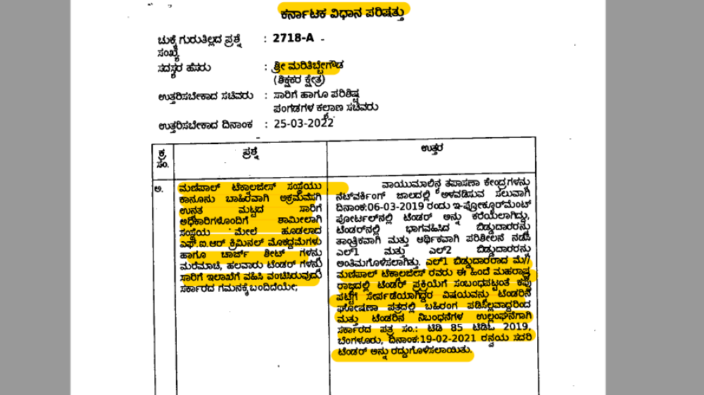 ಈ ಸಂಬಂಧ ವಿಧಾನಪರಿಷತ್‌ ಸದಸ್ಯ ಮರಿತಿಬ್ಬೇಗೌಡ ಅವರು ಕೇಳಿದ್ದ ಪ್ರಶ್ನೆಗೆ ಸಾರಿಗೆ ಸಚಿವ ಬಿ ಶ್ರೀರಾಮುಲು ಅವರು ವಿವರವಾಗಿ ಉತ್ತರವನ್ನು ಒದಗಿಸಿದ್ದಾರಲ್ಲದೇ ಮಣಿಪಾಲ್‌ ಟೆಕ್ನಾಲಜೀಸ್‌ ಪ್ರೈ ಲಿಮಿಟೆಡ್‌ನ್ನು ಟೆಂಡರ್‌ನಲ್ಲಿ ಬಿಡ್‌ ಮಾಡಲು ಅವಕಾಶ ಕಲ್ಪಿಸಿರುವ ಸಾರಿಗೆ ಇಲಾಖೆ ಅಧಿಕಾರಿಗಳ ವಿರುದ್ಧ ಒಂದೇ ಒಂದು ಕ್ರಮ ಜರುಗಿಸಿಲ್ಲ ಎಂಬುದನ್ನೂ ಉತ್ತರದಲ್ಲಿ ಬಹಿರಂಗಪಡಿಸಿದ್ದಾರೆ. ಇದರ ಪ್ರತಿಯು ‘ದಿ ಫೈಲ್‌’ಗೆ ಲಭ್ಯವಾಗಿದೆ.