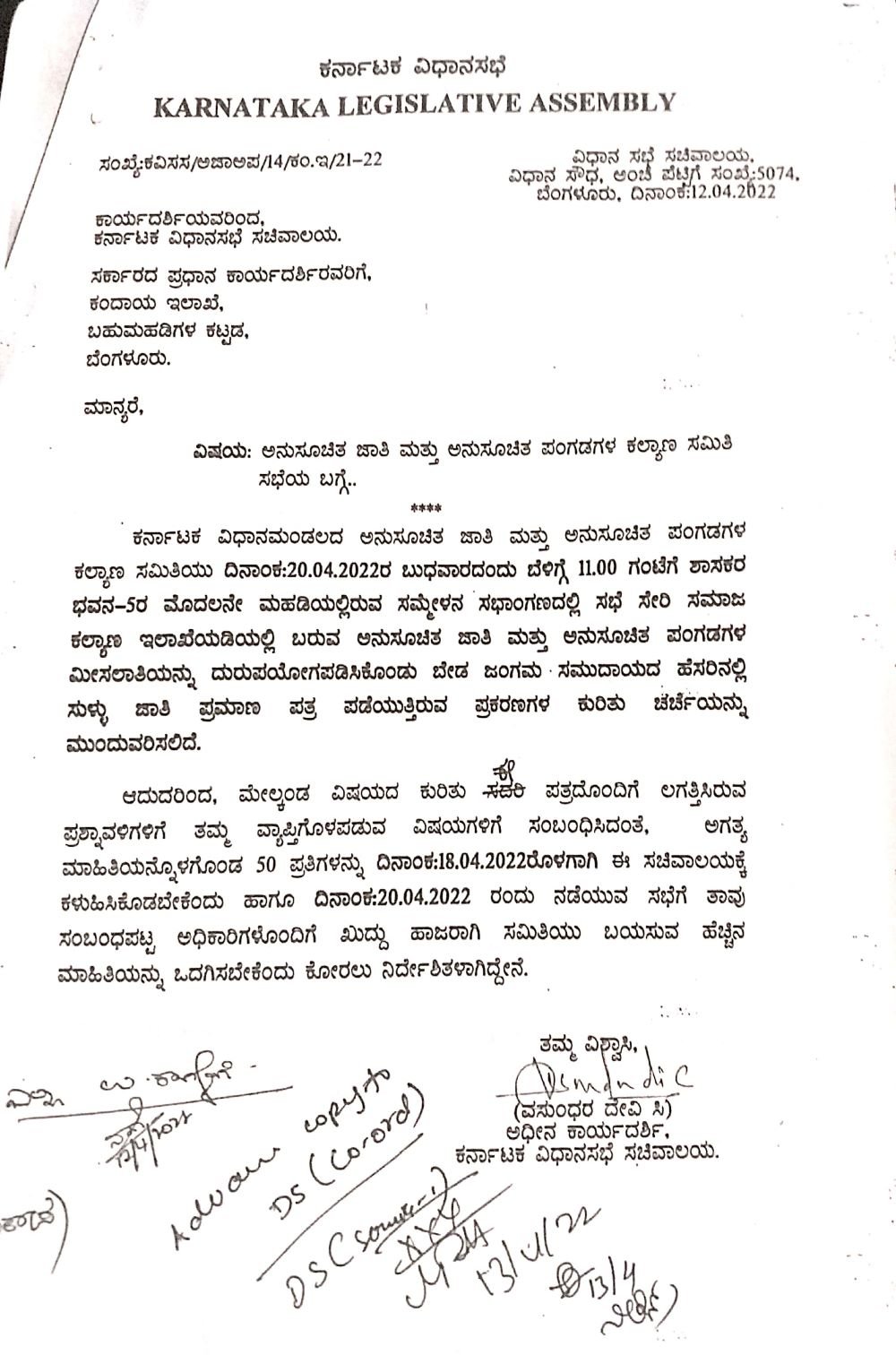 ಇದೇ 20ರಂದು ನಡೆಯಲಿರುವ ಸಭೆಗೆ ಸಮಗ್ರ ವಿವರಗಳನ್ನು ನೀಡಬೇಕು ಎಂದು ಕರ್ನಾಟಕ ವಿಧಾನಸಭೆಯ ಕಾರ್ಯದರ್ಶಿಯು ಕಂದಾಯ ಇಲಾಖೆಯ ಸರ್ಕಾರದ ಪ್ರಧಾನ ಕಾರ್ಯದರ್ಶಿಗೆ 2022ರ ಏಪ್ರಿಲ್ 12ರಂದು ನಿರ್ದೇಶನ ನೀಡಿದ್ದಾರೆ. ಇದರ ಪ್ರತಿಯು ‘ದಿ ಫೈಲ್’ಗೆ ಲಭ್ಯವಾಗಿದೆ.