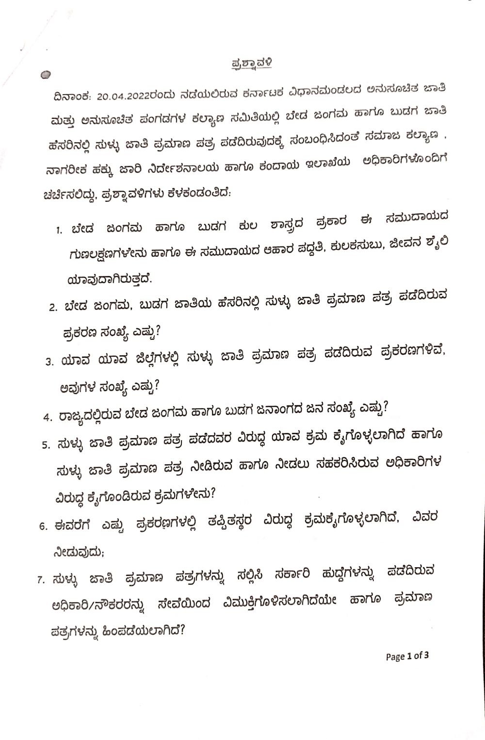 ಈ ಪ್ರಶ್ನಾವಳಿಗೆ 2022ರ ಏಪ್ರಿಲ್ 18ರೊಳಗೆ ಉತ್ತರ ಒದಗಿಸಬೇಕು ಎಂದು ವಿಧಾನಸಭೆ ಸಚಿವಾಲಯದ ಕಾರ್ಯದರ್ಶಿಗಳು ನಿರ್ದೇಶಿಸಿದ್ದಾರೆ.