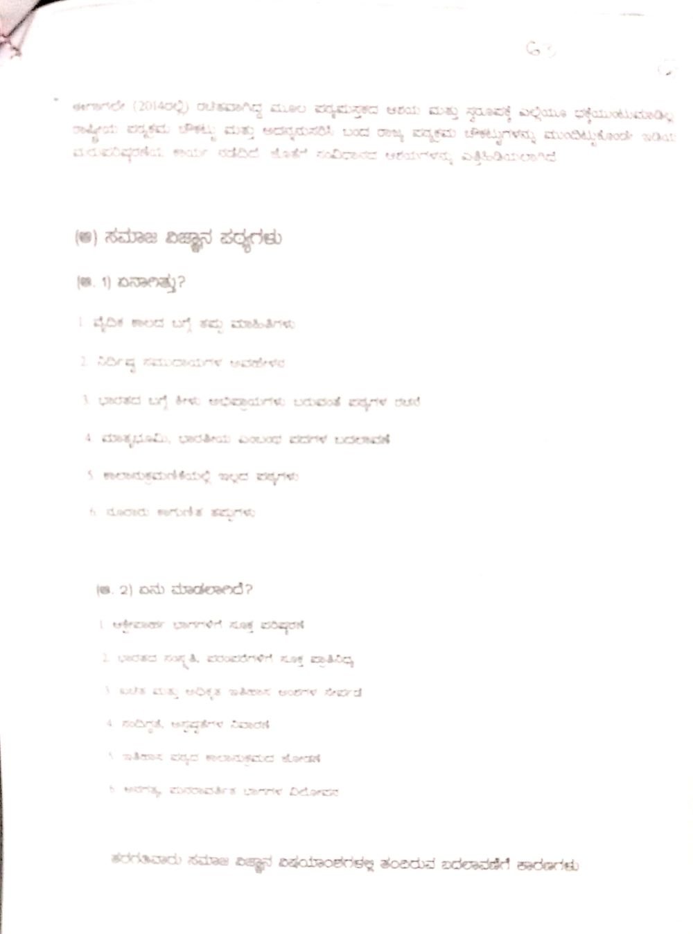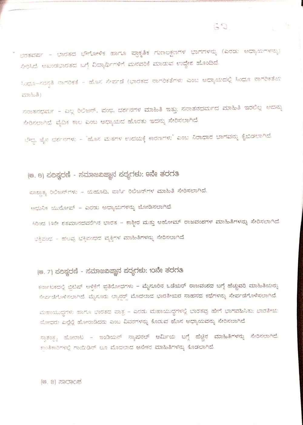 ಹಾಗೆಯೇ ಸಮಾಜ ವಿಜ್ಞಾನದ ವಿಷಯಾಂಶಗಳಲ್ಲಿ ತಂದಿರುವ ಬದಲಾವಣೆಗಳಿಗೆ ಕಾರಣಗಳನ್ನೂ ಸಮಿತಿಯು ವರದಿಯಲ್ಲಿ ವಿವರಿಸಿದೆ. 6ನೇ ತರಗತಿಯ ಸಮಾಜ ವಿಜ್ಞಾನ ಪಠ್ಯದಲ್ಲಿ ನಮ್ಮ ಹೆಮ್ಮೆಯ ರಾಜ್ಯ ಕರ್ನಾಟಕ ಭಾಗವನ್ನು ಸಂಕ್ಷಿಪ್ತಗೊಳಿಸಿ ಸಮಗ್ರವಾಗಿ ಕರ್ನಾಟಕ ಮಾಹಿತಿ ಸಿಗುವಂತೆ ಪರಿಷ್ಕರಿಸಿದೆ. ಭಾರತೀಯ ವೈಚಾರಿಕತೆ ಹಾಗೂ ಭಕ್ತಿಪಂಥ, ಚೈತನ್ಯ ಮಹಾಪ್ರಭು, ಶಂಕರದೇವ, ಮಾಧವದೇವ ಮುಂತಾದ ಶರಣರ ಮಾಹಿತಿಯನ್ನು ಹೊಸದಾಗಿ ಸೇರಿಸಿದೆ.