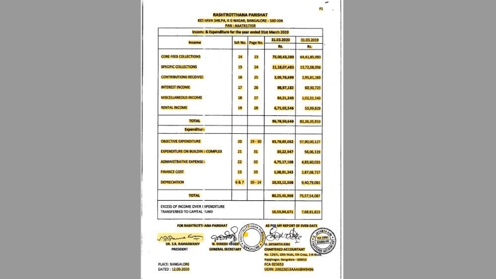 ರಾಷ್ಟ್ರೋತ್ಥಾನ ಪರಿಷತ್ನ ಕಳೆದ 5 ವರ್ಷದಲ್ಲಿ (2016ರಿಂದ 2020) 401.86 ಕೋಟಿ ರು. ಆದಾಯವಿದೆ. ಇದೇ ಅವಧಿಯಲ್ಲಿ 63.64 ಕೋಟಿ ರು. ಲಾಭಾಂಶವಿದೆ. 2019ರ ಮಾರ್ಚ್ 31ರ ಅಂತ್ಯಕ್ಕೆ ಸ್ಥಿರ ಮತ್ತ ಚರಾಸ್ತಿ ಮೌಲ್ಯ 208 ಕೋಟಿ ರು. ಇದ್ದರೆ, 2020ರ ಮಾರ್ಚ್ 31ರ ಅಂತ್ಯಕ್ಕೆ 218.27 ಕೋಟಿ ರು. ಇದೆ. 10.27 ಕೋಟಿ ರು. ಹೆಚ್ಚಳವಾಗಿರುವುದು ಆಡಿಟ್ ವರದಿಯಿಂದ ತಿಳಿದು ಬಂದಿದೆ.