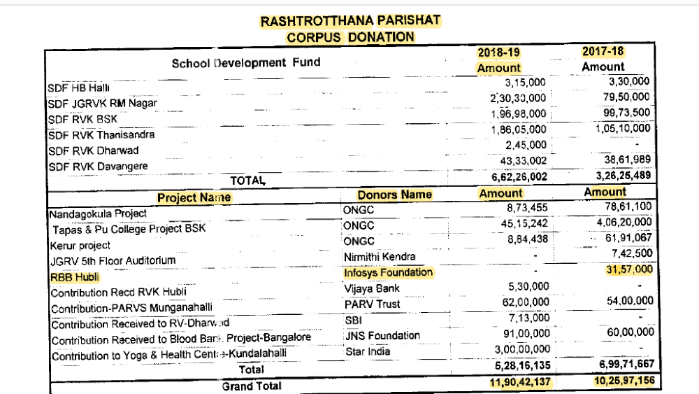 ಕಾರ್ಪಸ್ ಫಂಡ್ ಅಡಿಯಲ್ಲಿ ( ಹಗರಿಬೊಮ್ಮನಹಳ್ಳಿ, ಆರ್ ಎಂ ನಗರ್, ಬಿಎಸ್ಕೆ, ಥಣಿಸಂಸದ್ರ, ಧಾರವಾಡ, ದಾವಣಗೆರೆ) ಶಾಲಾ ಅಭಿ ವೃದ್ದಿ ನಿಧಿಯು 2018ರ ಮಾರ್ಚ್ ಅಂತ್ಯಕ್ಕೆ 3,26, 225,489 ರು., 2019ರ ಅಂತ್ಯಕ್ಕೆ 6, 62, 26, 002 ರು.ಗಳಾಗಿವೆ. ಒಎನ್ಜಿಸಿ, ನಿರ್ಮಿತಿ ಕೇಂದ್ರ, ಇನ್ಫೋಸಿಸ್ ಫೌಂಡೇಷನ್, ವಿಜಯ ಬ್ಯಾಂಕ್, ಪಿಎಆರ್ವಿ ಟ್ರಸ್ಟ್, ಎಸ್ಬಿಐ, ಜೆಎನ್ಎಸ್ ಫೌಂಡೇಷನ್, ಸ್ಟಾರ್ ಇಂಡಿಯಾ ಸಂಸ್ಥೆಗಳಿಂದ 2018ರ ಅಂತ್ಯಕ್ಕೆ 6, 99, 71, 667 ರು., 2019ರ ಅಂತ್ಯಕ್ಕೆ 5,28, 16, 135 ರು.ಗಳು ಸಂಗ್ರಹವಾಗಿವೆ. ಈ ಪೈಕಿ ಇನ್ಫೋಸಿಸ್ ಫೌಂಡೇಷನ್ 2018ರ ಮಾರ್ಚ್ ಅಂತ್ಯಕ್ಕೆ ಒಟ್ಟು 31, 57, 000 ರು. ದೇಣಿಗೆ ನೀಡಿರುವುದು ಆಡಿಟ್ ವರದಿಯಿಂದ ಗೊತ್ತಾಗಿದೆ.
