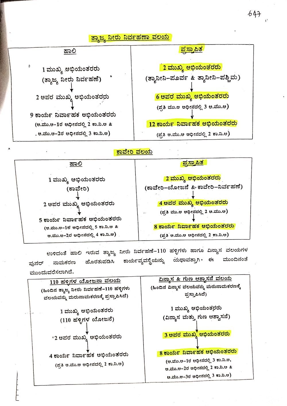 ನಿರ್ವಹಣಾ ವಲಯದಲ್ಲಿ ಪೂರ್ವ, ಶ್ಚಿಮ, ಉತ್ತರ ಮತ್ತು ದಕ್ಷಿಣ ವಲಯದಲ್ಲಿ 4 ಮುಖ್ಯ ಅಭಿಯಂತರರು, 9 ಅಪರ ಮುಖ್ಯ ಅಭಿಯಂತರರು, 17 ಕಾರ್ಯನಿರ್ವಾಹಕ ಅಭಿಯಂತರರು, ತ್ಯಾಜ್ಯ ನೀರು ನಿರ್ವಹಣಾ ವಲಯದಲ್ಲಿ 2 ಮುಖ್ಯ ಅಭಿಯಂತರರು, 6 ಅಪರ ಮುಖ್ಯ ಅಭಿಯಂತರರು, 12 ಕಾರ್ಯನಿರ್ವಾಹಕ ಅಭಿಯಂತರರು, ಕಾವೇರಿ ವಲಯದಲ್ಲಿ 2 ಮುಖ್ಯ ಅಭಿಯಂತರರು, 4 ಅಪರ ಮುಖ್ಯ ಅಭಿಯಂತರರು, 8 ಕಾರ್ಯನಿರ್ವಾಹಕ ಅಭಿಯಂತರರು, ವಿನ್ಯಾಸ ಮತ್ತು ಗುಣ ಆಶ್ವಾಸನೆ ವಲಯದಲ್ಲಿ 1 ಮುಖ್ಯ ಅಭಿಯಂತರರ ಹುದ್ದೆಯನ್ನು ಹೊಸದಾಗಿ ಸೃಜಿಸಲು ಮಂಡಳಿಯು ಪ್ರಸ್ತಾಪಿಸಿದೆ.