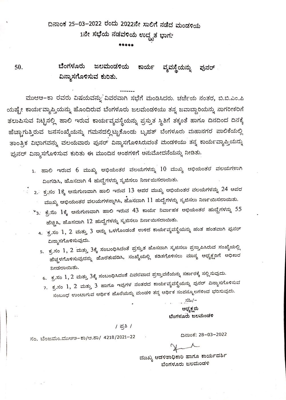 ‘ಬಿಬಿಎಂಪಿಯಷ್ಟೇ ಕಾರ್ಯವ್ಯಾಪ್ತಿಯನ್ನು ಹೊಂದಿರುವ ಬೆಂಗಳೂರು ಜಲಮಂಡಳಿಯು ತನ್ನ ಜವಾಬ್ದಾರಿಯನ್ನು ನಾಗರಿಕರಿಗೆ ತಲುಪಿಸುವ ನಿಟ್ಟಿನಲ್ಲಿ ಹಾಲಿ ಇರುವ ಕಾರ್ಯವ್ಯವಸ್ಥೆಯನ್ನು ಪ್ರಸ್ತುತ ಸ್ಥಿತಿಗೆ ತಕ್ಕಂತೆ ಹಾಗೂ ದಿನದಿಂದ ದಿನಕ್ಕೆ ಹೆಚ್ಚಾಗುತ್ತಿರುವ ಜನಸಂಖ್ಯೆಯನ್ನು ಗಮನದಲ್ಲಿರಿಸಿಕೊಂಡು ಬೃಹತ್ ಬೆಂಗಳೂರು ಮಹಾನಗರಪಾಲಿಕೆಯಲ್ಲಿ ತಾಂತ್ರಿಕ ವಿಭಾಗವನ್ನು ವಲಯವಾರು ಪುನರ್ ವಿನ್ಯಾಸಗೊಳಿಸಿರುವಂತೆ ಮಂಡಳಿಯು ತನ್ನ ಕಾರ್ಯವ್ಯಾಪ್ತಿಯನ್ನು ಪುನರ್ ವಿನ್ಯಾಸಗೊಳಿಸಲು ಹೊಸದಾಗಿ ಹುದ್ದೆಗಳನ್ನು ಮಂಡಳಿಯು 2022ರ ಮಾರ್ಚ್ 25ರಂದು ಅನುಮೋದಿಸಿದೆ.