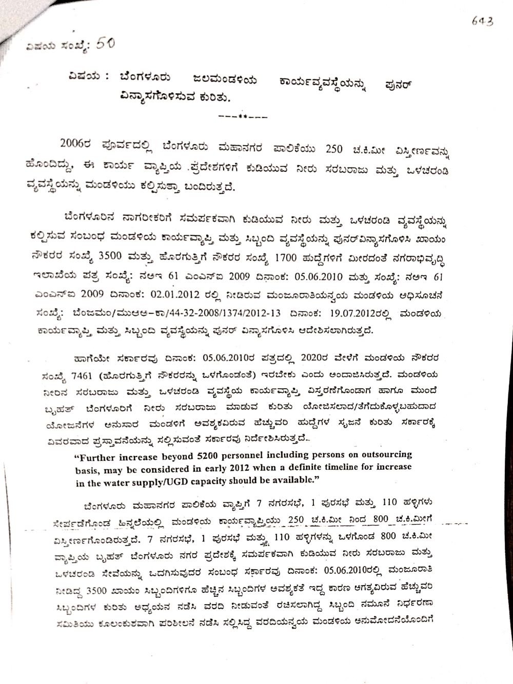 ಆದರೆ ಮಂಡಳಿಯ ನೀರಿನ ಸರಬರಾಜು ಮತ್ತು ಒಳಚರಂಡಿ ವ್ಯವಸ್ಥೆಯ ಕಾರ್ಯವ್ಯಾಪ್ತಿ ವಿಸ್ತರಣೆಗೊಂಡಾಗ ಹಾಗೂ ಮುಂದೆ ಬೃಹತ್ ಬೆಂಗಳೂರಿಗೆ ನೀರು ಸರಬರಾಜು ಮಾಡುವ ಕುರಿತು ಯೋಜಿಸಲಾಧ ಯೋಜನೆಗಳ ಅನುಸಾರ ಮಂಡಳಿಗೆ ಅವಶ್ಯಕವಿರುವ ಹೆಚ್ಚುವರಿ ಹುದ್ದೆಗಳ ಸೃಜನೆ ಕುರಿತು ಸರ್ಕಾರಕ್ಕೆ ವಿವರವಾದ ಪ್ರಸ್ತಾವನೆ ಸಲ್ಲಿಕೆಯಾಗಿದೆ ಎಂದು ಮಂಡಳಿಯು ವಾದಿಸುತ್ತಿದೆ.
