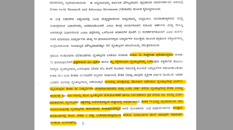 2006-07ರಿಂದ 2017-18ರವರೆಗೆ ಕರ್ನಾಟಕದಲ್ಲಿ ಸರ್ಕಾರಿ ಮತ್ತುಅನುದಾನಿತ ಶಾಲೆಗಳು, ಸಮಾಜ ಕಲ್ಯಾಣ ಇಲಾಖೆಯ ವಸತಿ ನಿಲಯಗಳಲ್ಲಿ ಅಧ್ಯಯನ ಮಾಡುತ್ತಿರುವ 8ನೇ ತರಗತಿ ವಿದ್ಯಾರ್ಥಿಗಳಿಗೆ ಉಚಿತ ಬೈಸಿಕಲ್ ಪೂರೈಕೆ ಯೋಜನೆ ಕುರಿತು ಗ್ರಾಸ್ರೂಟ್ಸ್ ರಿಸರ್ಚ್ ಅಂಡ್ ಅಡ್ವೊಕಸಿ ಮೂವ್ಮೆಂಟ್ ಸಂಸ್ಥೆಯ ಮೂಲಕ ನಡೆಸಿದ್ದ ಮೌಲ್ಯಮಾಪನ ವರದಿಯು 2021ರ ನವೆಂಬರ್ನಲ್ಲಿ ಸರ್ಕಾರಕ್ಕೆ ಸಲ್ಲಿಕೆಯಾಗಿದೆ. ಈ ವರದಿಯ ಪ್ರತಿಯೂ ‘ದಿ ಫೈಲ್’ಗೆ ಲಭ್ಯವಾಗಿದೆ.