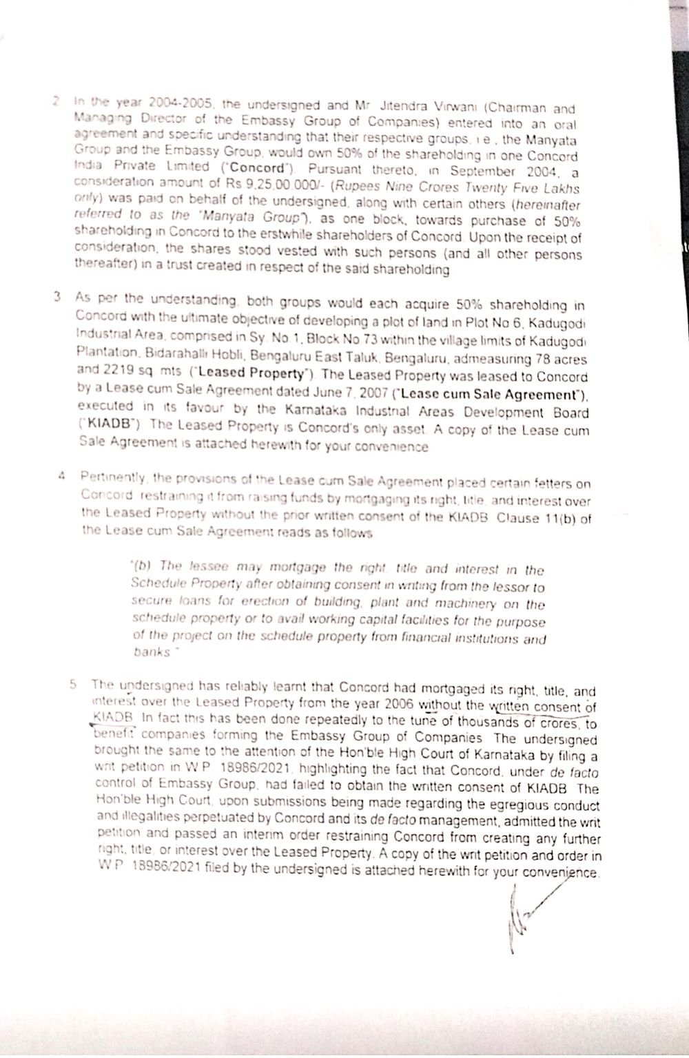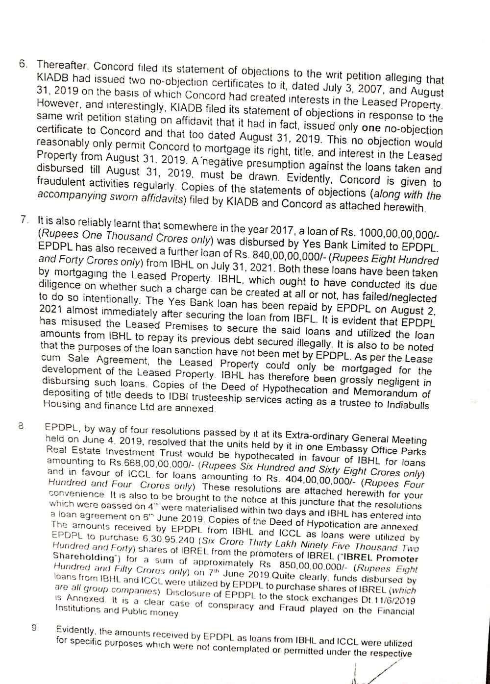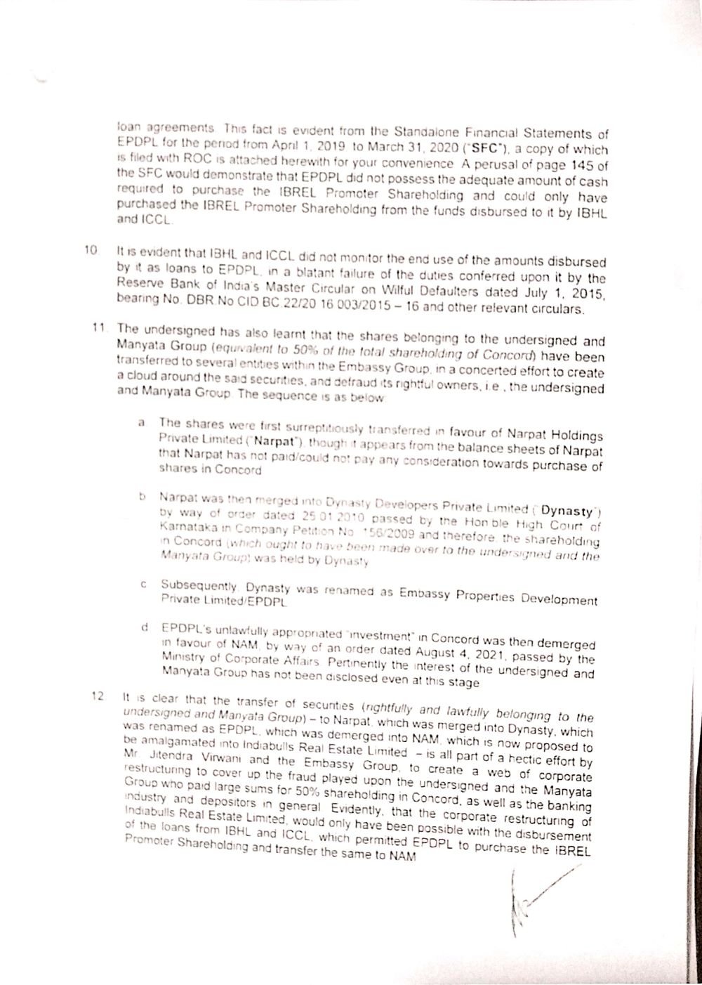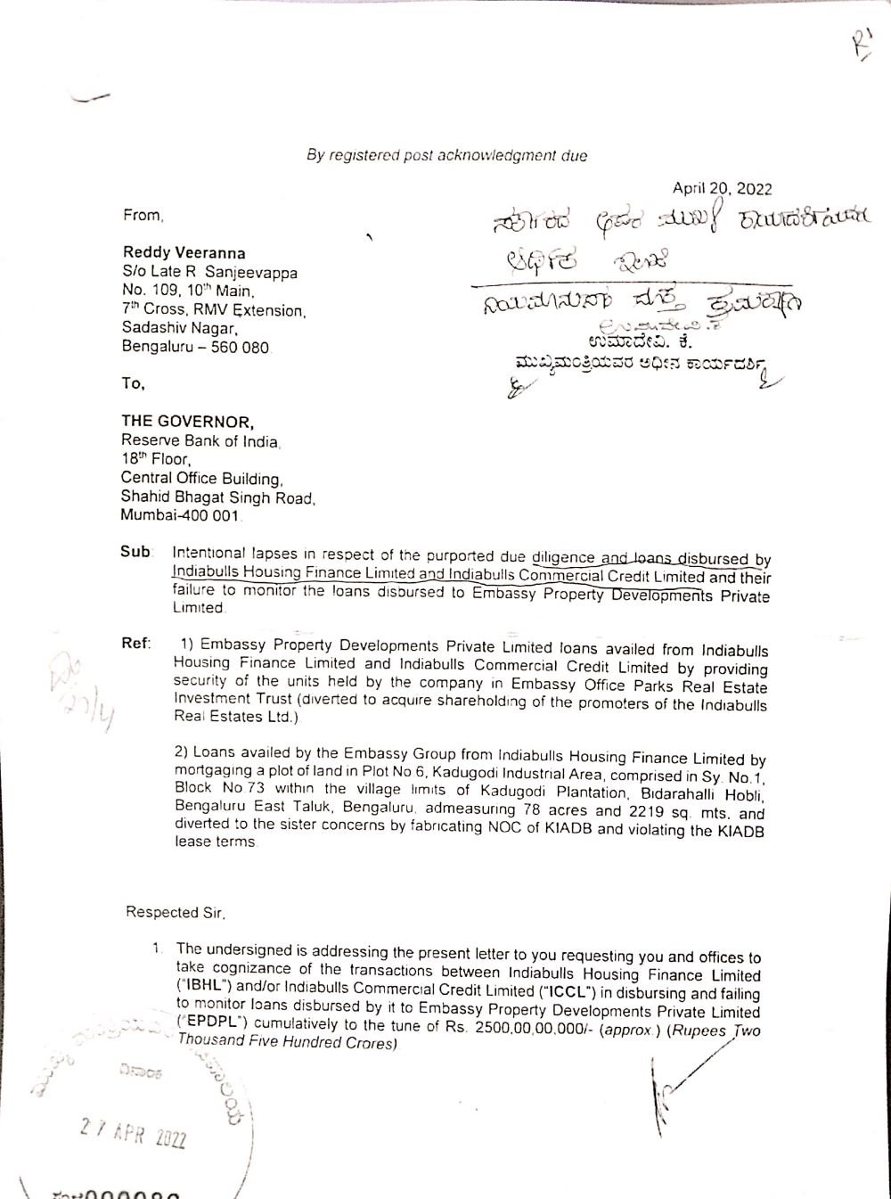 ಆದರೆ ಎಂಬೆಸ್ಸಿ ಕಂಒಪನಿಯು 2017ರಲ್ಲಿ ಇದೇ ಸ್ವತ್ತನ್ನು ಅಡವಿಟ್ಟು ಯೆಸ್‌ ಬ್ಯಾಂಕ್‌ನಿಂದ 1,000 ಕೋಟಿ ರು., ಇಂಡಿಯಾ ಬುಲ್ಸ್‌ ಹೌಸಿಂಗ್‌ ಫೈನಾನ್ಸ್‌ ಲಿಮಿಟೆಡ್‌ (ಐಬಿಎಚ್‌ಎಲ್‌)ನಿಂದ 2021ರ ಜುಲೈ 31ರಂದು 840 ಕೋಟಿ ರು. ಸಾಲ ಎತ್ತಿದೆ ಎಂಬ ವಿಚಾರವು ರೆಡ್ಡಿ ವೀರಣ್ಣ ಅವರು ಸಲ್ಲಿಸಿರುವ ದೂರಿನಿಂದ ತಿಳಿದು ಬಂದಿದೆ.