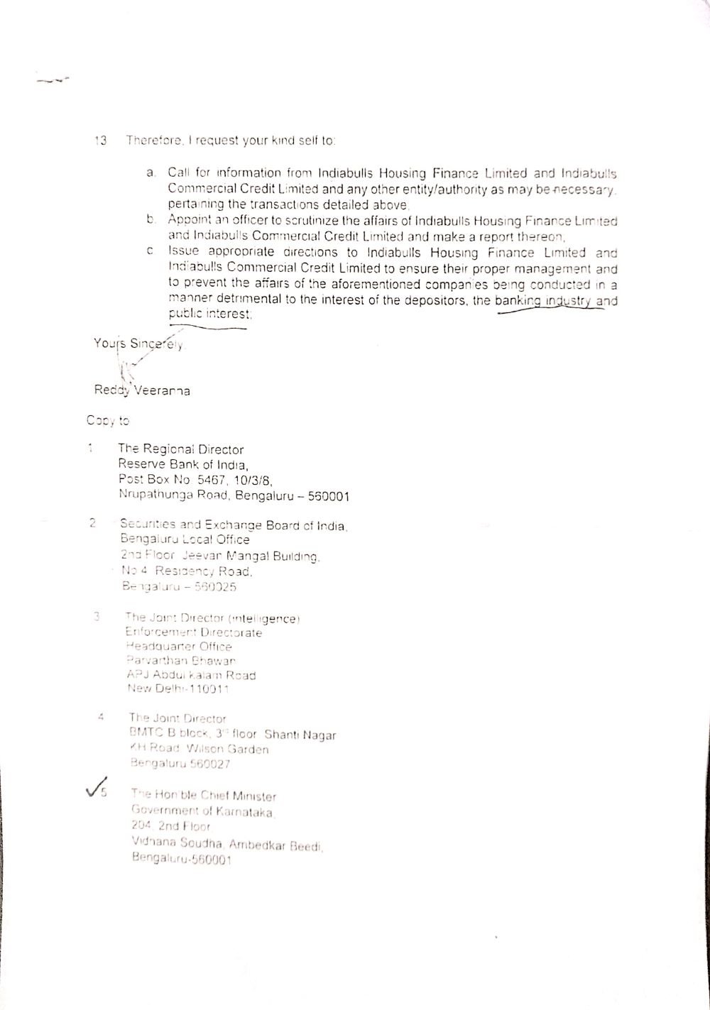 ಆ ಹಣವನ್ನು ಇಂಡಿಯಾ ಬುಲ್ಸ್‌ ರಿಯಲ್‌ ಎಸ್ಟೇಟ್‌ ಲಿಮಿಟೆಡ್‌ (ಐಬಿಆರ್‌ಇಎಲ್‌)ನ 6,30,95,240 ಷೇರುಗಳನ್ನು ಖರೀದಿಸಲು ಉಪಯೋಗಿಸಲಾಗಿದೆ. ಇದರ ಹಿಂದೆ ಪಿತೂರಿ ಮತ್ತು ವಂಚನೆ ಅಡಗಿದೆ ಎಂದು ದೂರಿನಲ್ಲಿ ರೆಡ್ಡಿ ವೀರಣ್ಣ ಅವರು ವಿವರಿಸಿದ್ದಾರೆ.