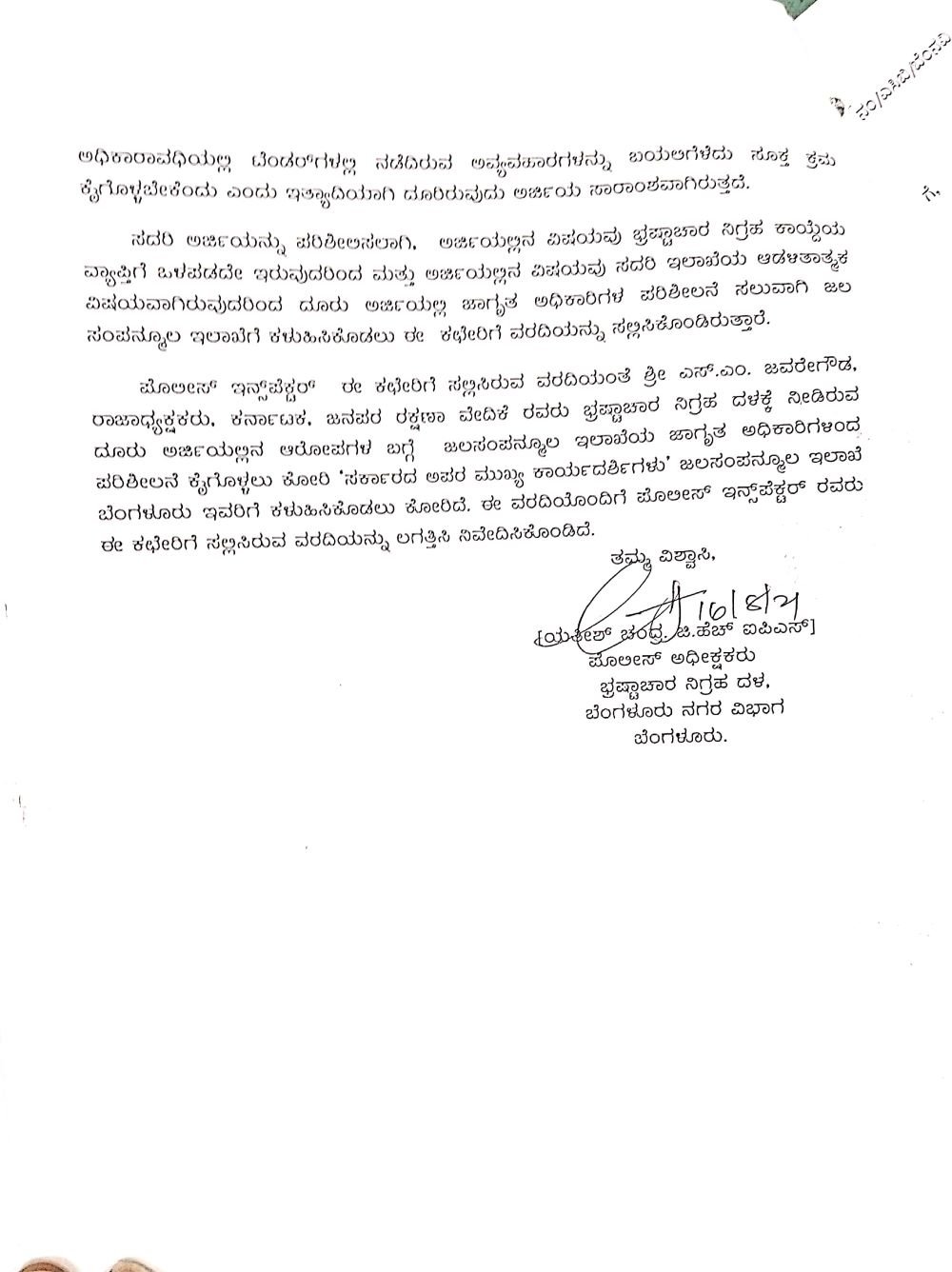 ‘ಪೊಲೀಸ್ ಇನ್ಸ್ಪೆಕ್ಟರ್ ಸಲ್ಲಿಸಿರುವ ವರದಿಯಂತೆ ಎಸ್ ಎಂ ಜವರೇಗೌಡ ಅವರು ನೀಡಿರುವ ದೂರು ಅರ್ಜಿಯಲ್ಲಿನ ಆರೋಪಗಳ ಬಗ್ಗೆ ಜಲಸಂಪನ್ನೂಲ ಇಲಾಖೆಯ ಜಾಗೃತ ಅಧಿಕಾರಿಗಳಿಂದ ಪರಿಶೀಲನೆ ಕೈಗೊಳ್ಳಬೇಕು. ಇದನ್ನು ಇಲಾಖೆಯ ಸರ್ಕಾರದ ಅಪರ ಮುಖ್ಯ ಕಾರ್ಯದರ್ಶಿಗಳಿಗೆ ಕಳಿಸಿಕೊಡಬೇಕು,’ ಎಂದು ಎಸಿಬಿಯ ಎಸ್ಪಿ ಯತೀಶ್ ಚಂದ್ರ ಅವರು 2021ರ ಆಗಸ್ಟ್ 16ರಂದು ಎಸಿಬಿಯ ಎಡಿಜಿಪಿ ಅವರಿಗೆ ಪತ್ರ ಬರೆದಿದ್ದರು.